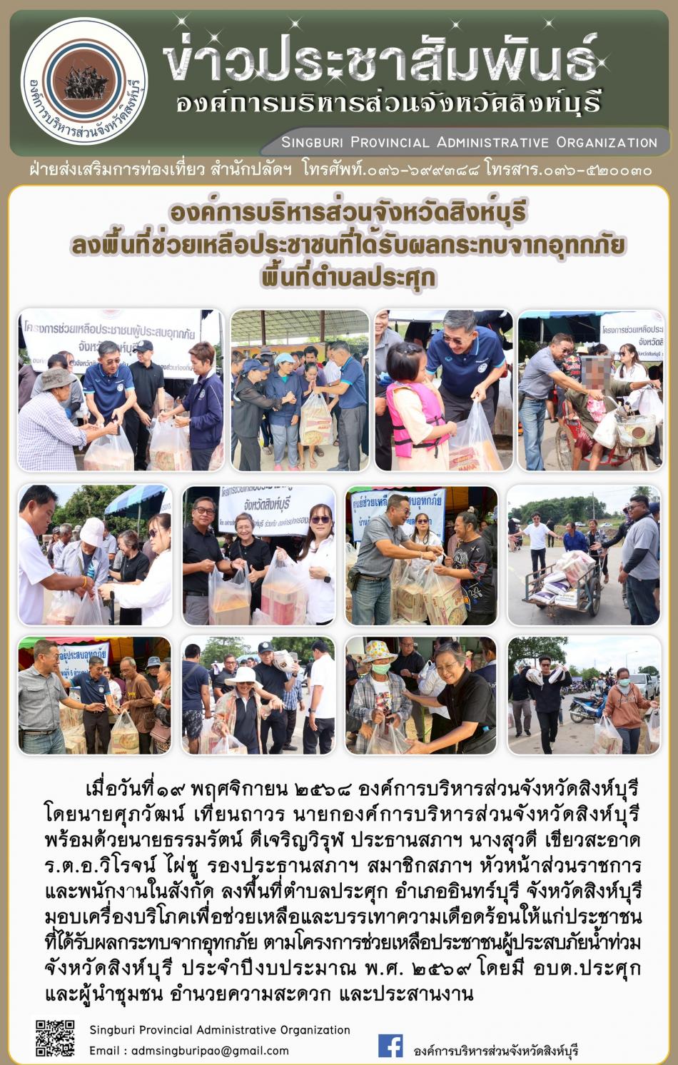 องค์การบริหารส่วนจังหวัดสิงห์บุรี ลงพื้นที่ช่วยเหลือประชาชนที่ได้รับผลกระทบจากอุทกภัย พื้นที่ตำบลประศุก[19 พฤศจิกายน 2568]