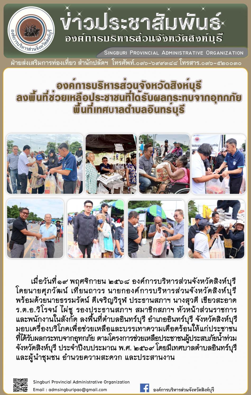 องค์การบริหารส่วนจังหวัดสิงห์บุรี ลงพื้นที่ช่วยเหลือประชาชนที่ได้รับผลกระทบจากอุทกภัย พื้นที่เทศบาลตำบลอินทร์บุรี[19 พฤศจิกายน 2568]