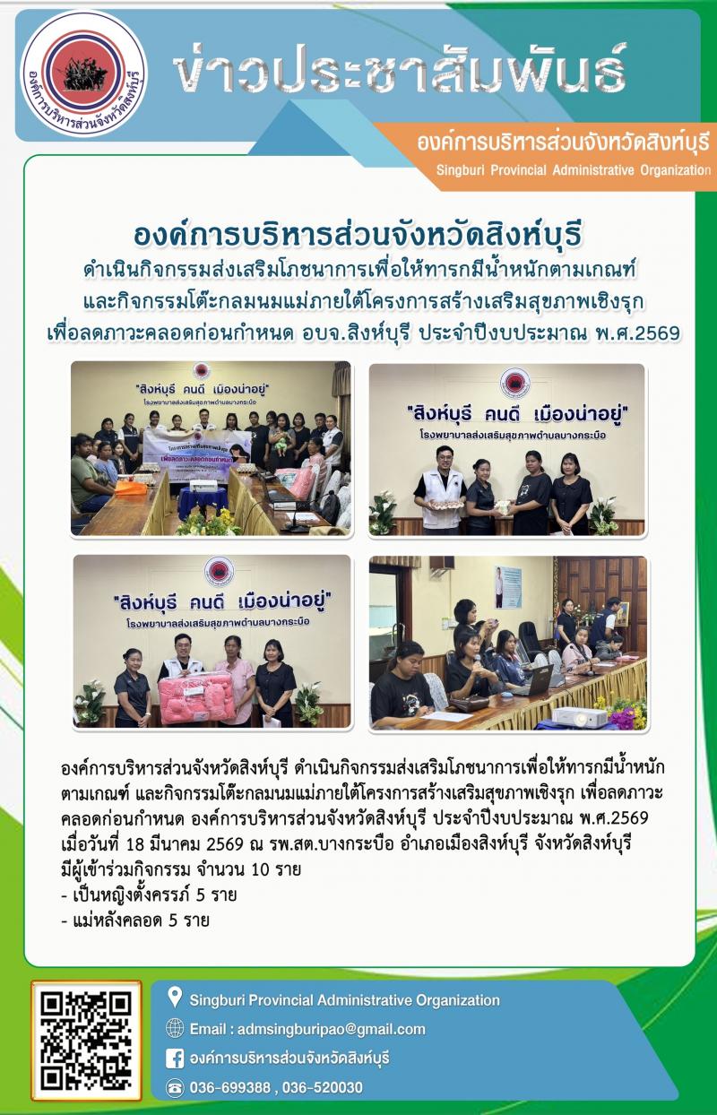 อบจ.สิงห์บุรี ดำเนินกิจกรรมส่งเสริมภาวะโภกิจกรรมส่งเสริมภาวะโภชนาการให้หญิงตั้งครรภ์ และทารกในครรภ์ ภายใต้โครงการเสริมสร้างสุขภาพเชิงรุก เพื่อลดภาวะคลอดก่อนกำหนด
