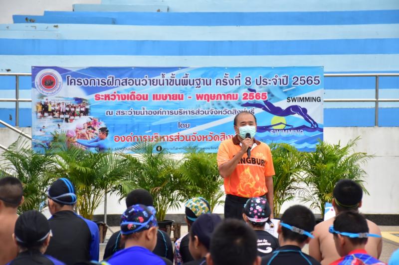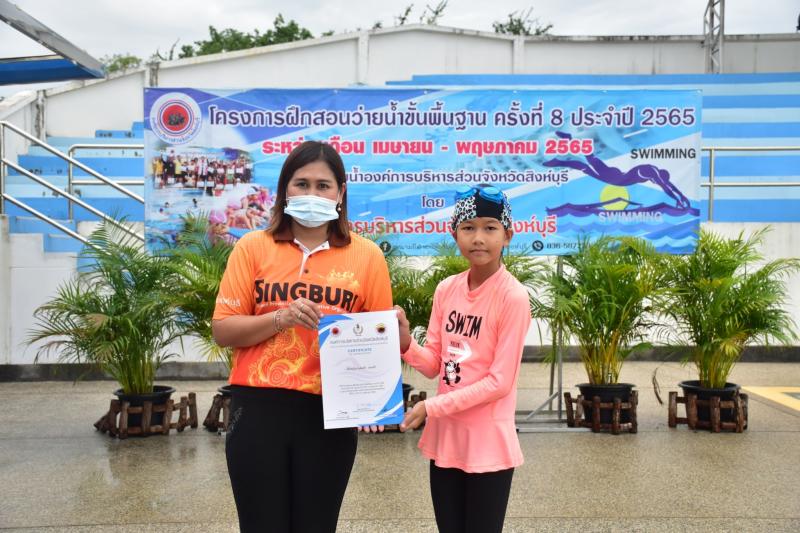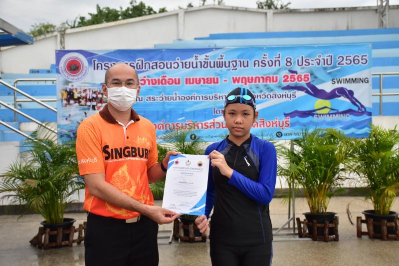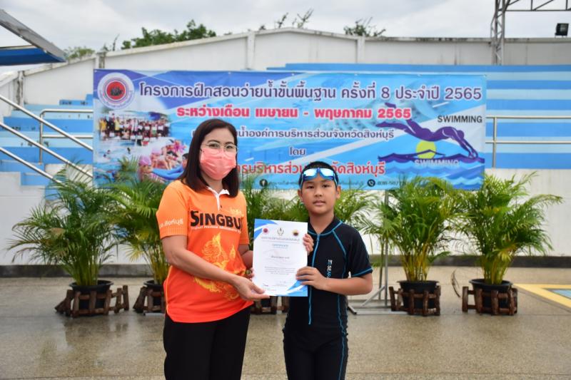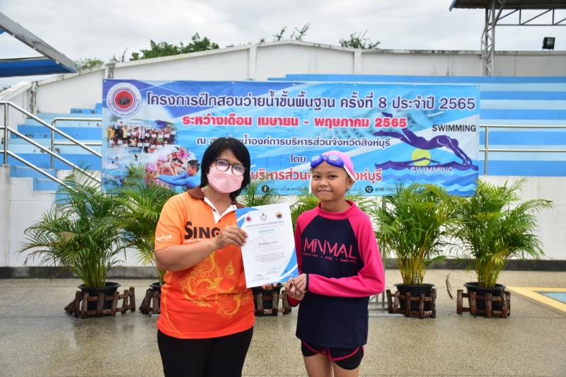 อบจ.สิงห์บุรี มอบเกียรติบัตรโครงการฝึกสอนว่ายน้ำขั้นพื้นฐาน ครั้งที่ 8 ประจำปี 2565 ให้ผู้ที่ผ่านการอบรมจำนวน 45 คน