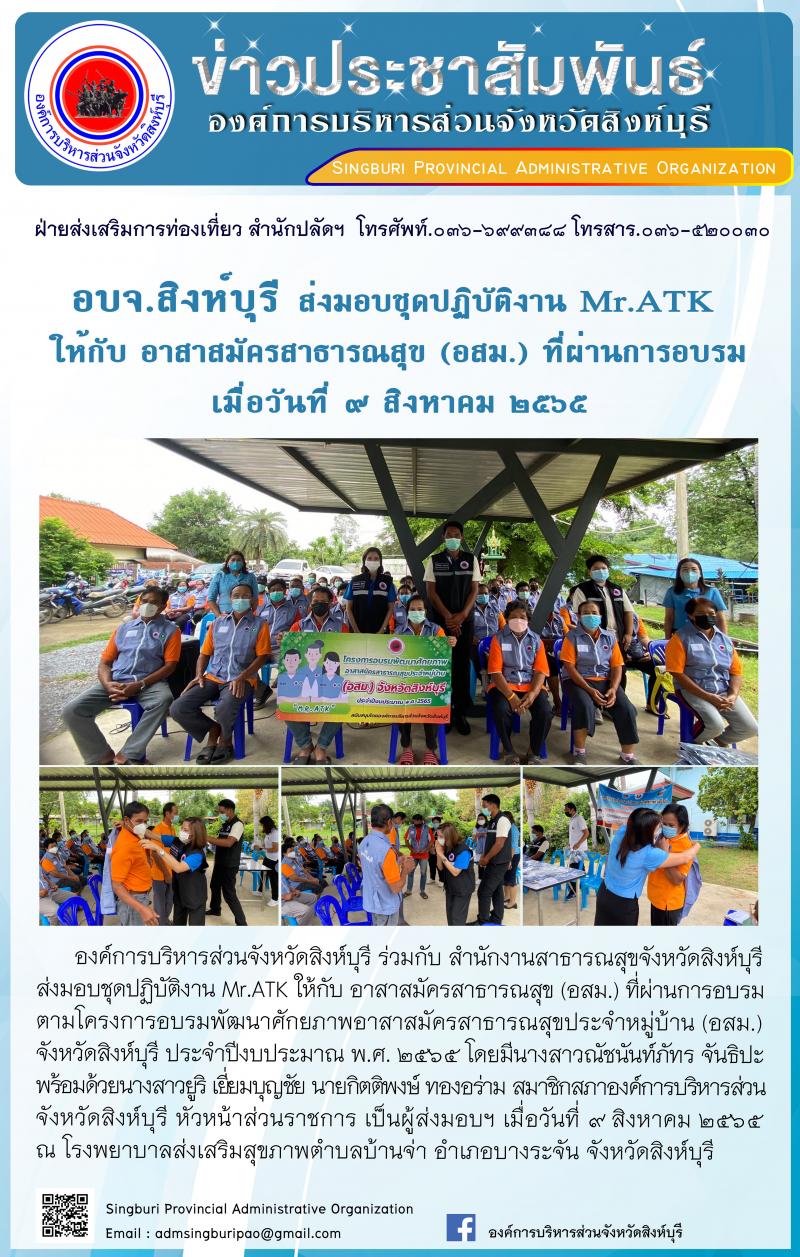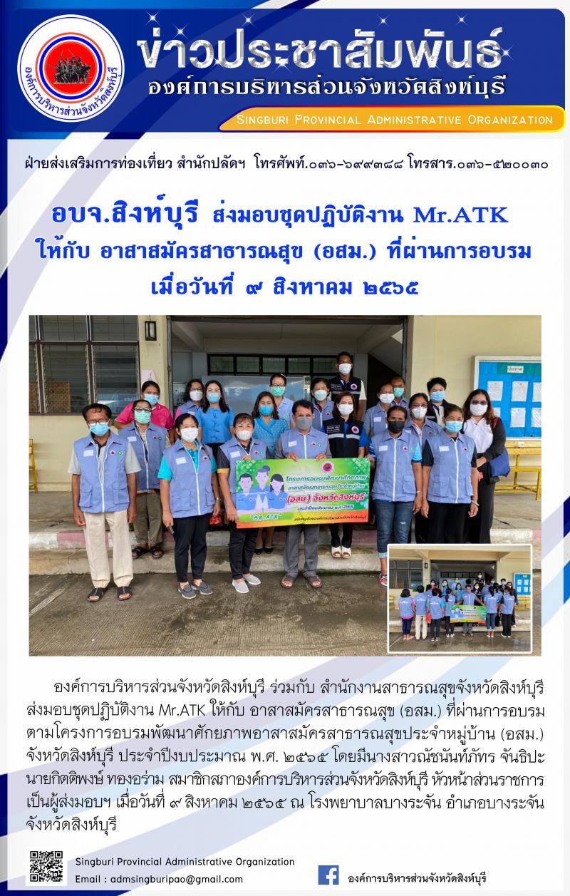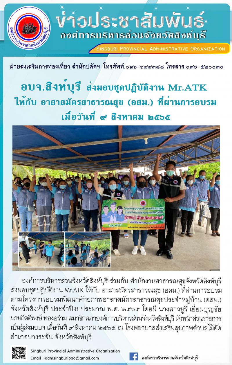 อบจ.สิงห์บุรี ส่งมอบชุดปฏิบัติงาน MR. ATK ให้กับ อาสาสมัครสาธารณสุข(อสม.)ที่ผ่านการฝึกอบรม