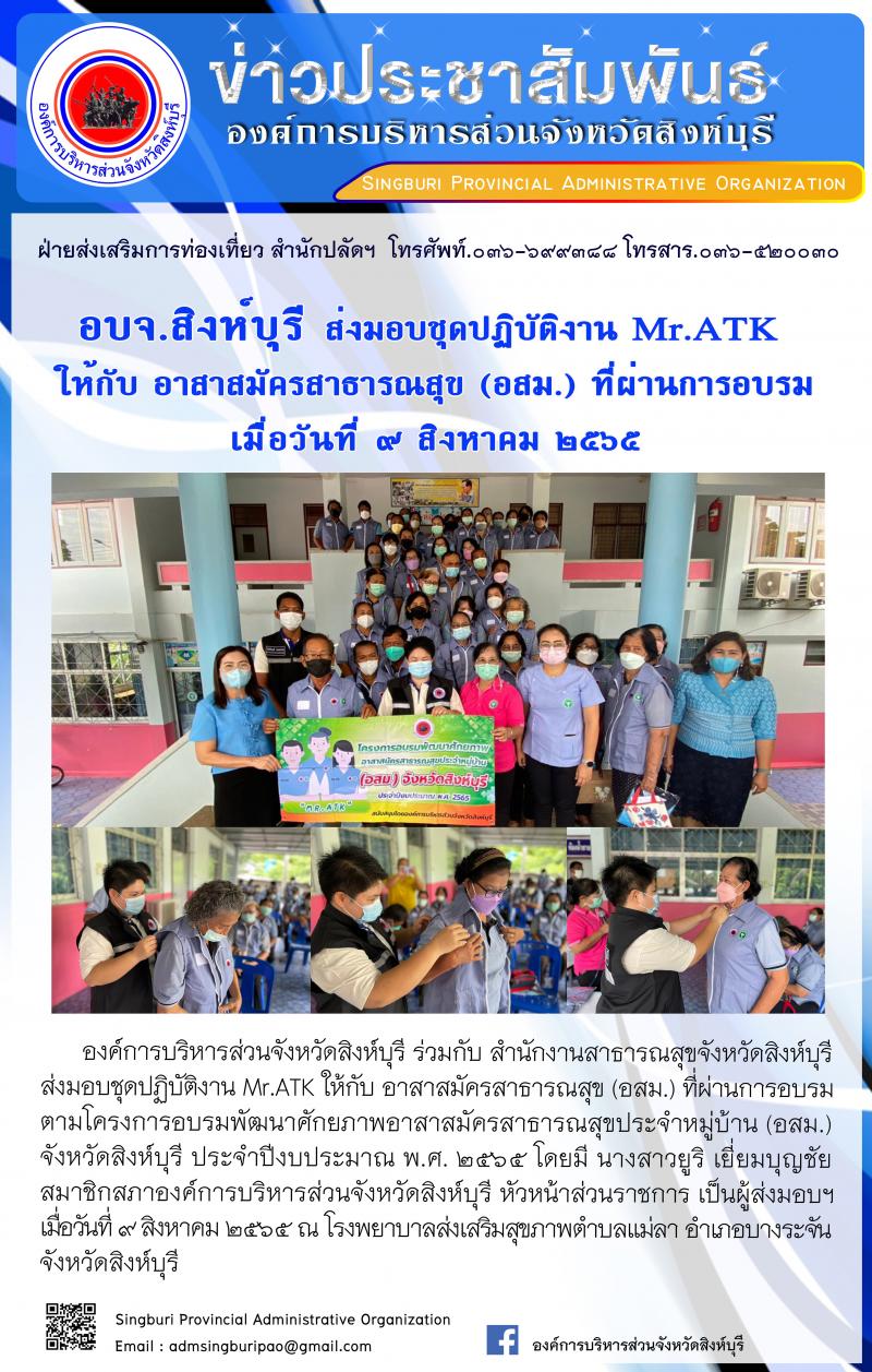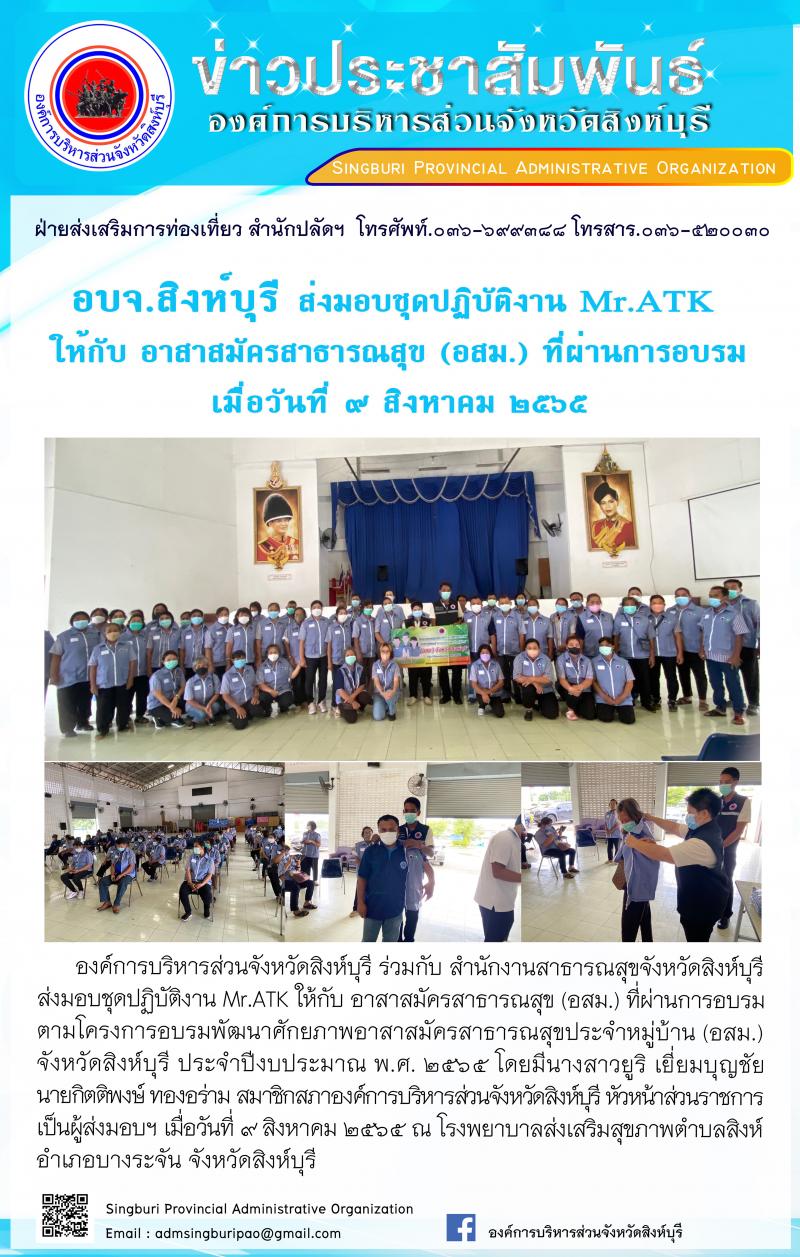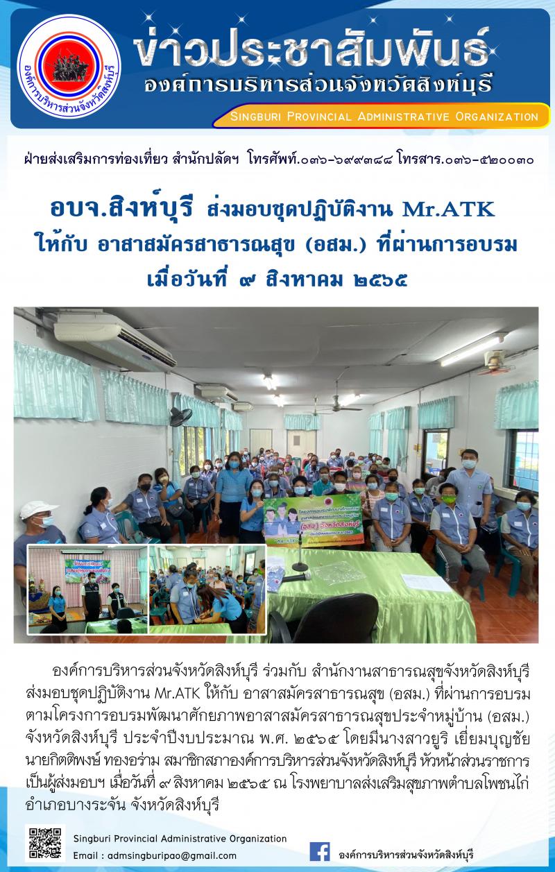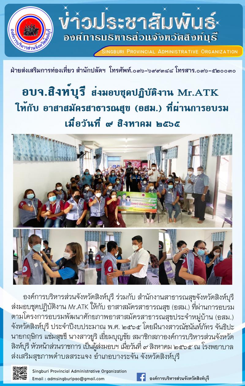 อบจ.สิงห์บุรี ส่งมอบชุดปฏิบัติงาน MR. ATK ให้กับ อาสาสมัครสาธารณสุข(อสม.)ที่ผ่านการฝึกอบรม
