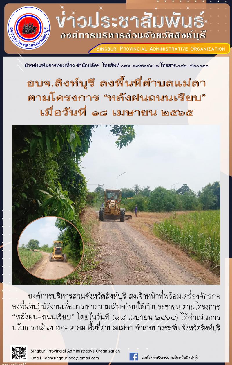 อบจ.สิงห์บุรี ลงพื้นที่ตำบลบางน้ำเชี่ยว และตำบลแม่ลา ตามโครงการ "หลังฝนถนนเรียบ"