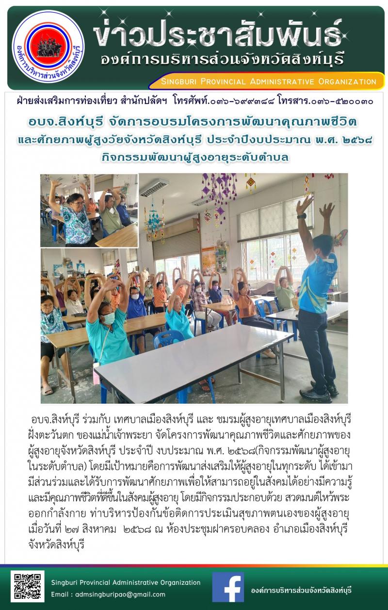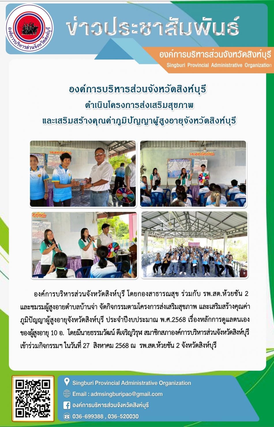 องค์การบริหารส่วนจังหวัดสิงห์บุรี เดำเนินโครงการส่งเสริมสุขภาพและเสริมสร้างคุณค่าผู้สูงอายุจังหวัดสิงห์บุรี