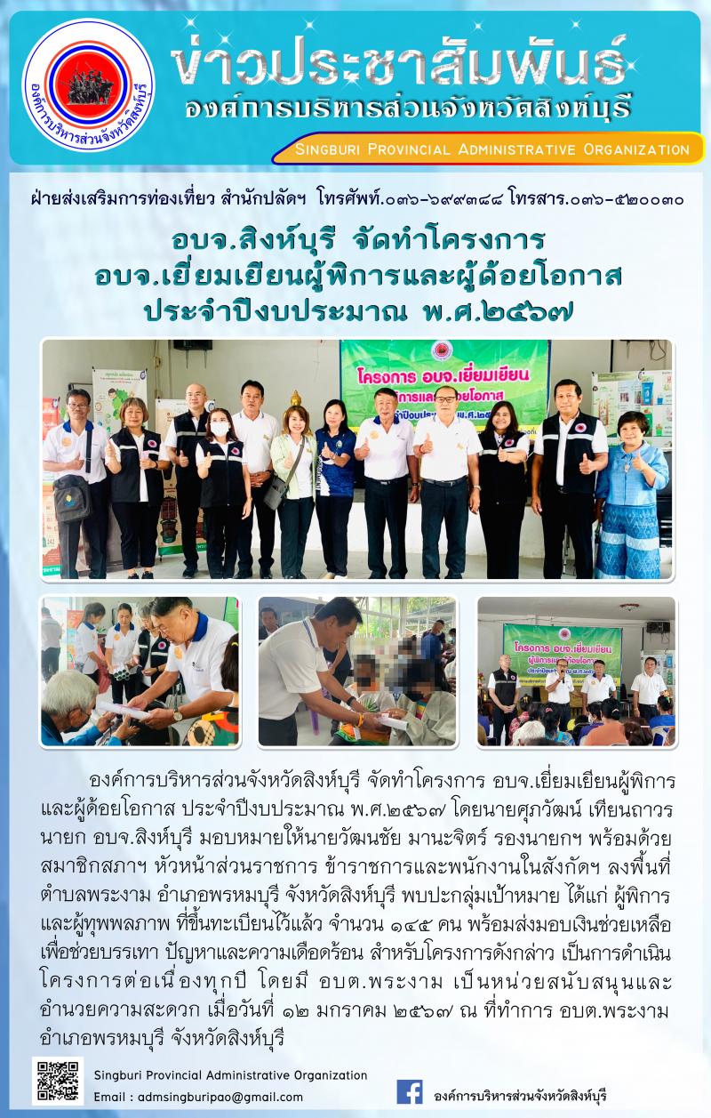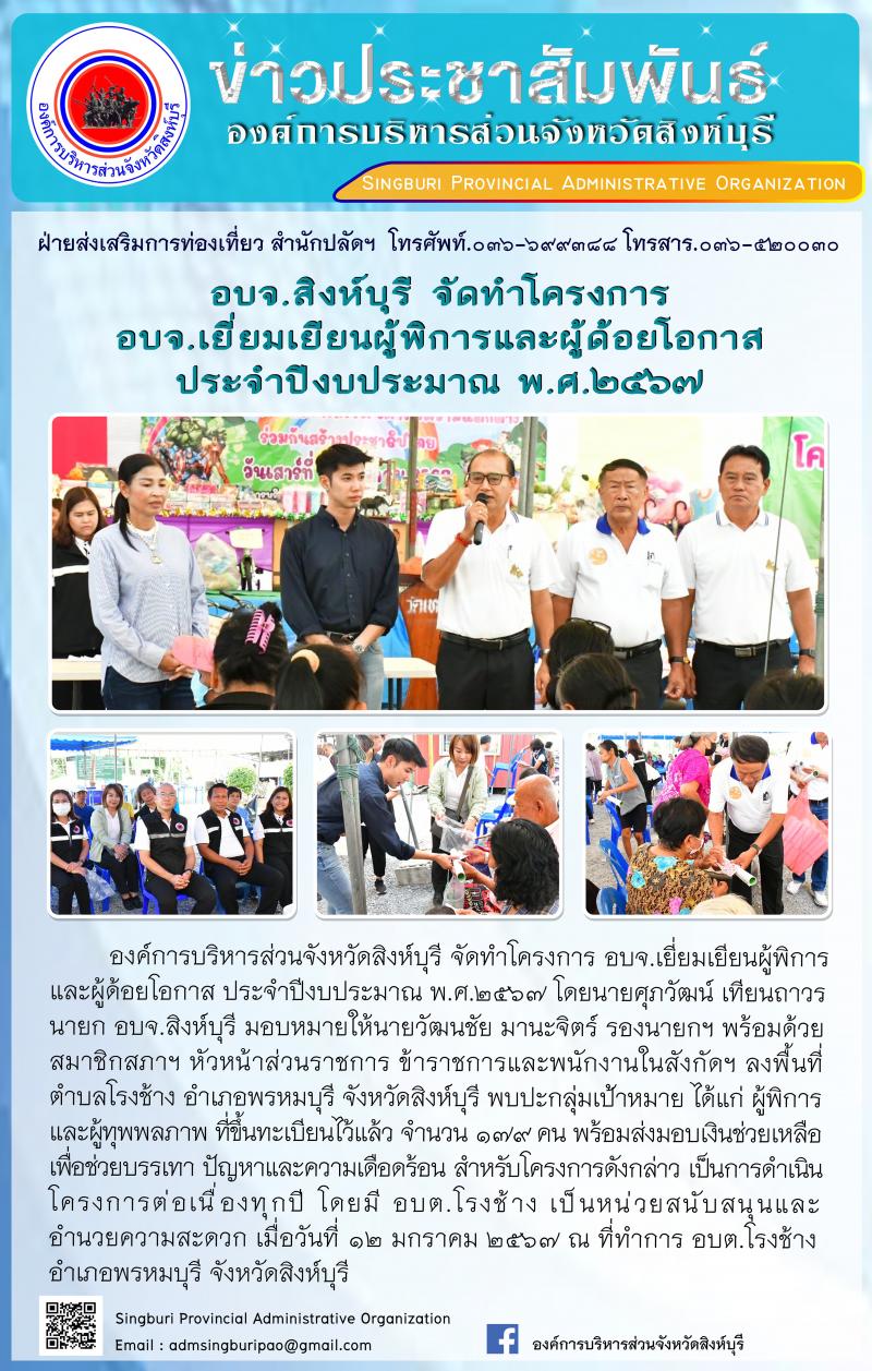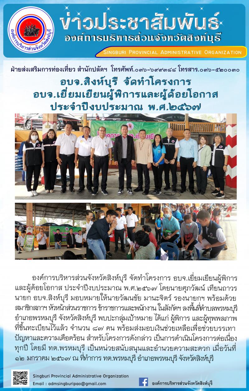 อบจ.สิงห์บุรี จัดทำโครงการ อบจ.เยี่ยมเยียนผู้พิการและผู้ด้อยโอกาส ประจำปี 2567