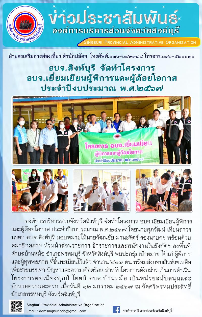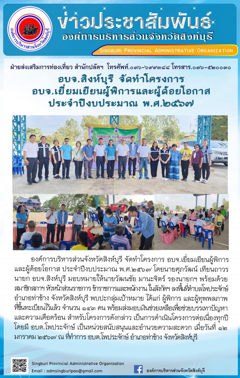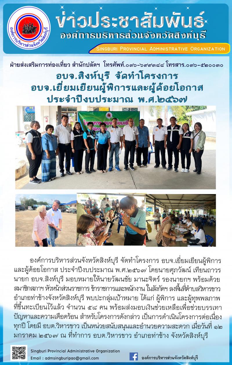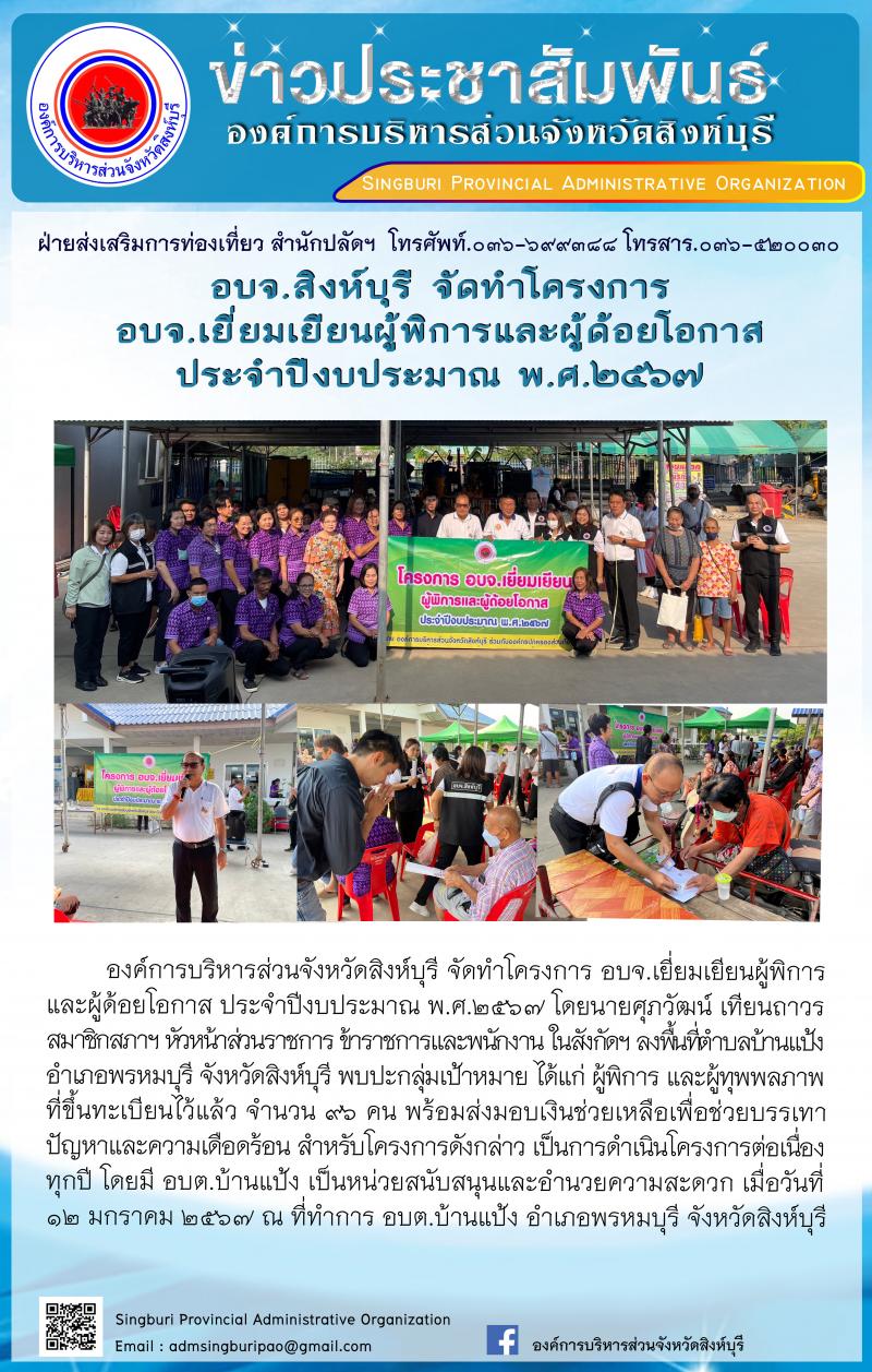 อบจ.สิงห์บุรี จัดทำโครงการ อบจ.เยี่ยมเยียนผู้พิการและผู้ด้อยโอกาส ประจำปี 2567