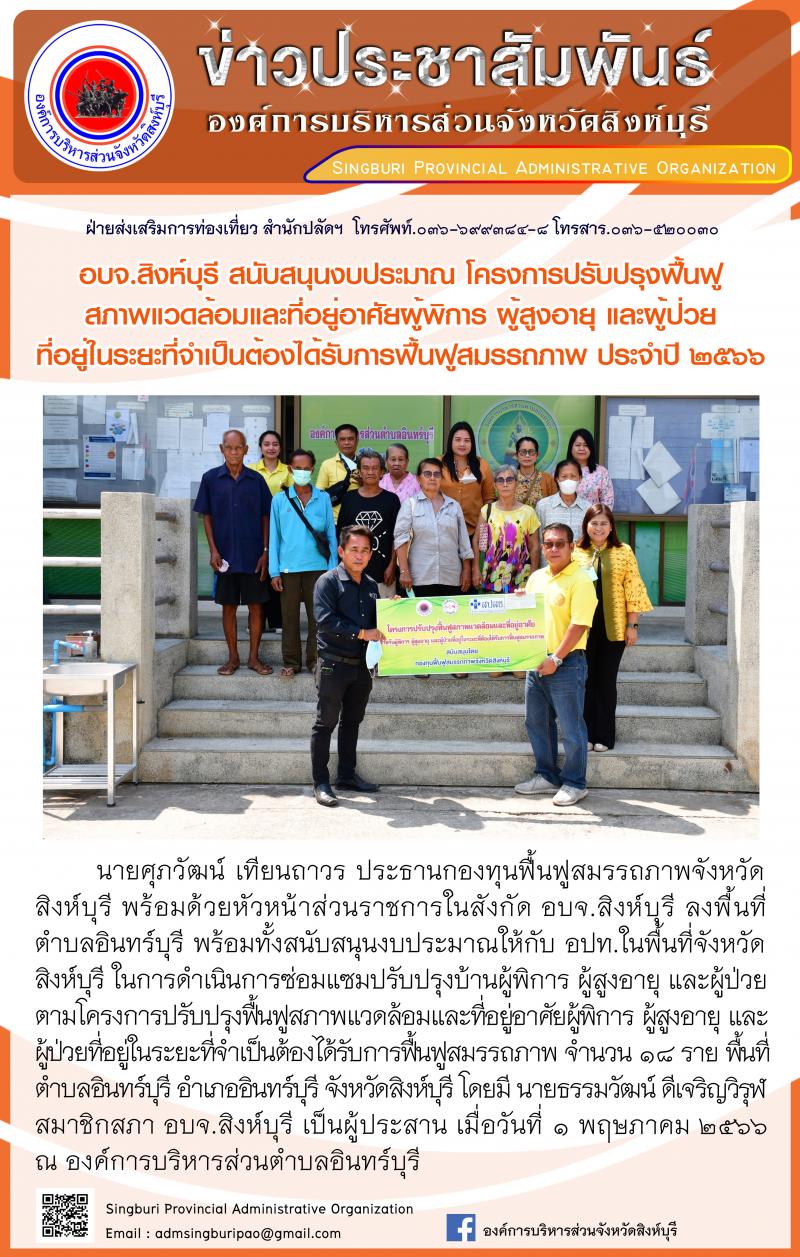 อบจ.สิงห์บุรี สนับสนุนงบประมาณ โครงการปรับปรุงฟื้นฟูสภาพแวดล้อมและที่อยู่อาศัยผู้พิการ ผู้สูงอายุ และผู้ป่วยที่อยู่ในระยะที่จำเปฌนต้องได้รับการฟื้นฟูสมรรถภาพ ประจำปี 2566