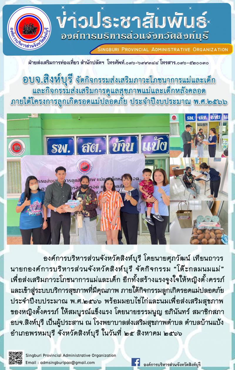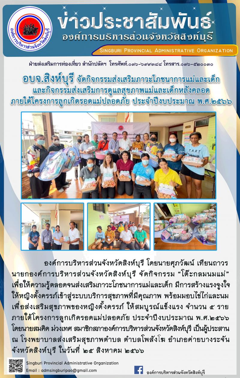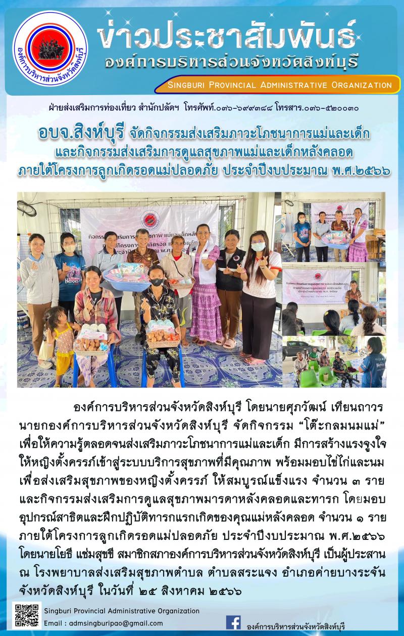 อบจ.สิงห์บุรี จัดกิจกรรมส่งเสริมภาวะโภชนาการแม่และเด็กและกิจกรรมส่งเสริมการดูแลสุขภาพแม่และเด็กหลังคลอดภายใต้โครงการลูกเกิดรอดแม่ปลอดภัย ประจำปีงบประมาณ พ.ศ.2566
