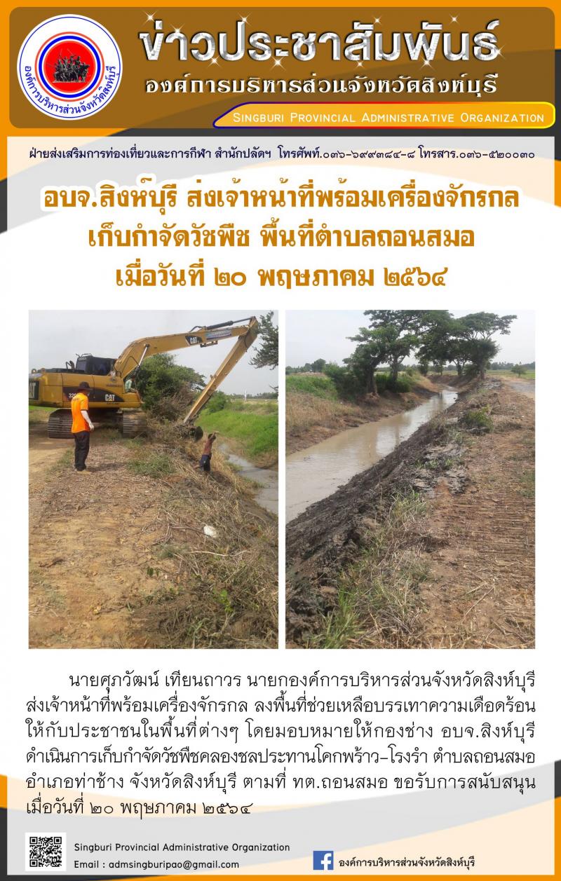 อบจ.สิงห์บุรี ส่งเจ้าหน้าทีพร้อมเครื่อจักรกลเก็บกำจัดวัชพืช บริเวณด้านหน้าศูนย์ราชการ