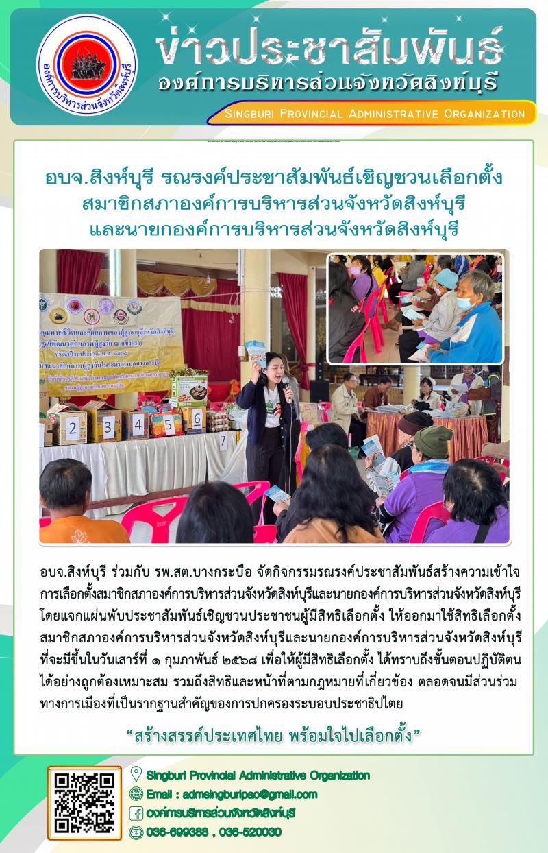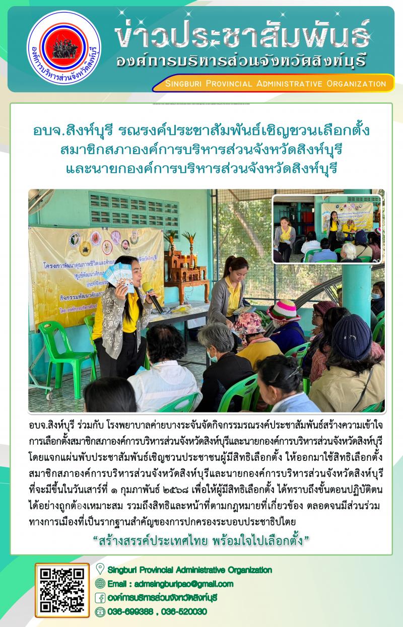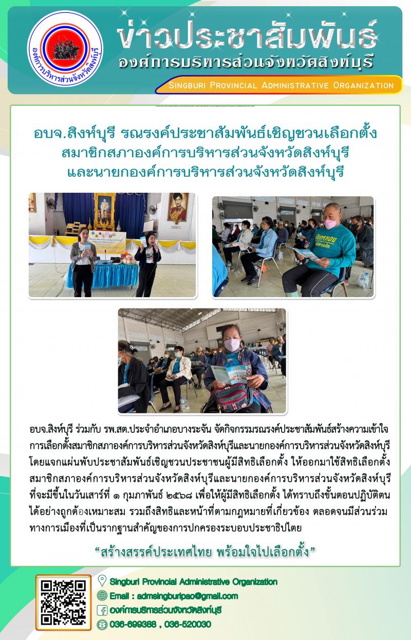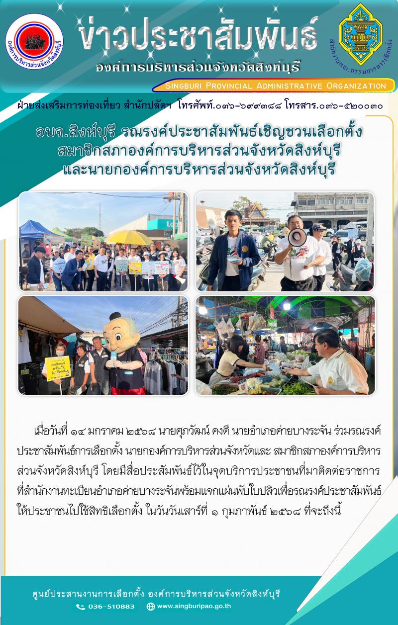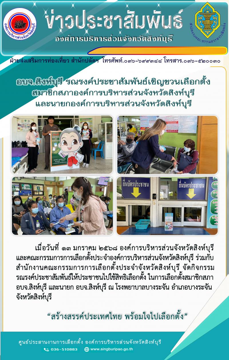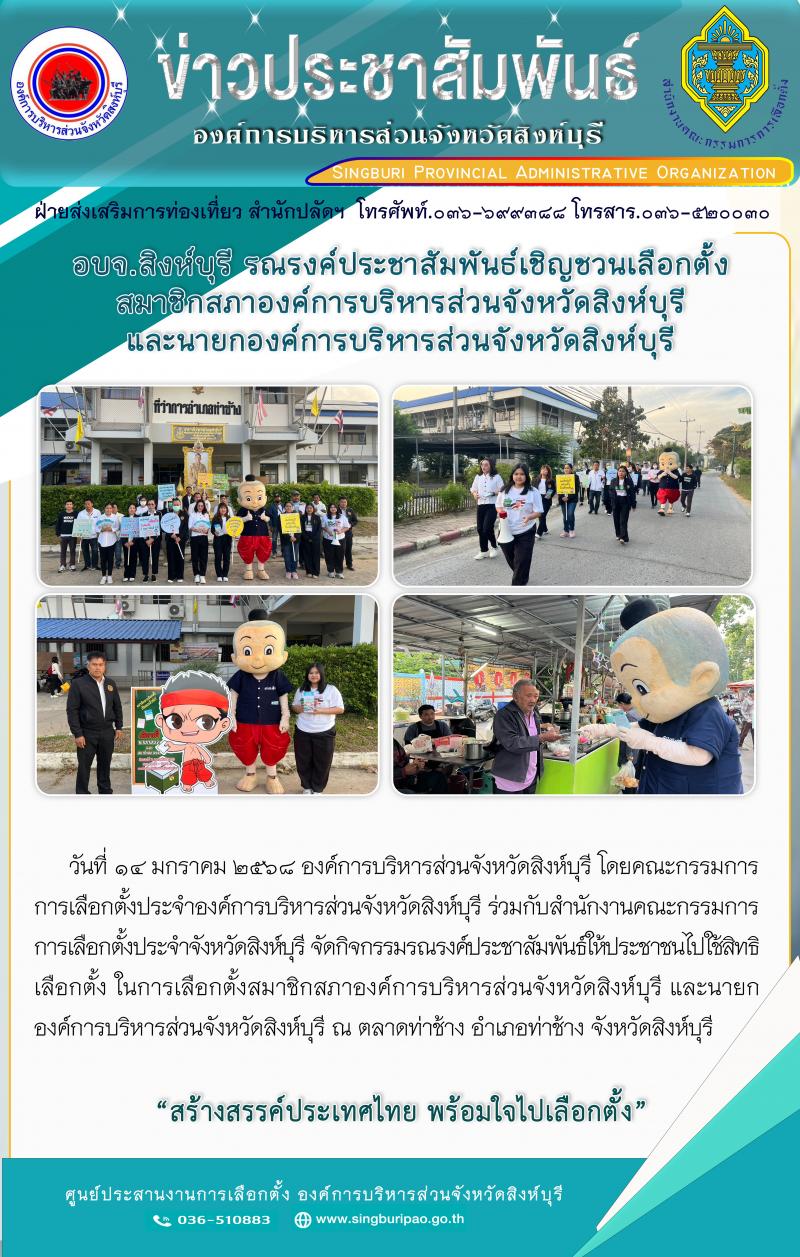 อบจ.สิงห์บุรี รณรงค์ประชาสัมพันธ์เชิญชวนเลือกตั้งสมาชิกสภาองค์การบริหารส่วนจังหวัดสิงห์บุรี และนายกองค์การบริหารส่วนจังหวัดสิงห์บุรี
