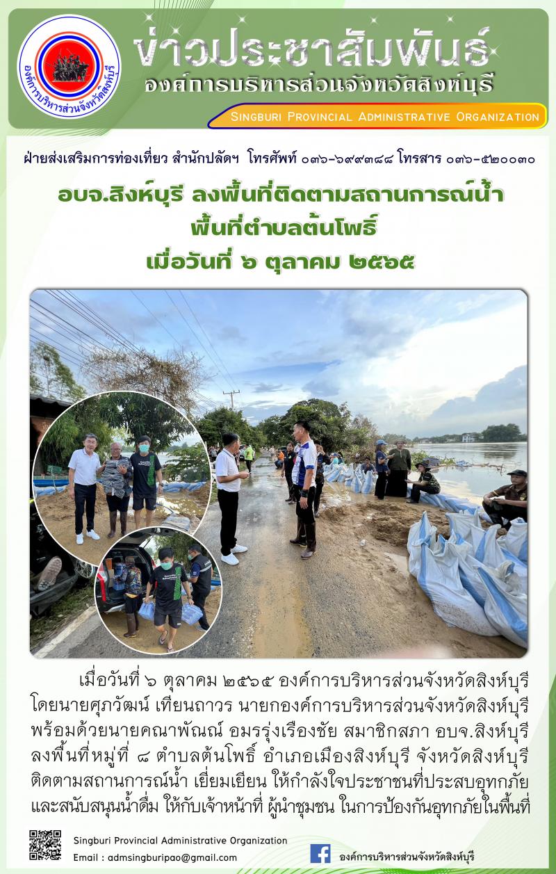 อบจ.สิงห์บุรี ลงพื้นที่ติดตามสถานณ์การน้ำ พื้นที่ตำบลต้นโพธิ์