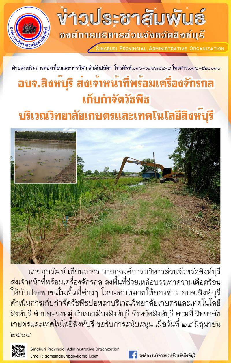 อบจ.สิงห์บุรี ส่งเจ้าหน้าทีพร้อมเครื่อจักรกลเก็บกำจัดวัชพืช พื้นที่ตำบลโพทะเล และบริเวณวิทยาลัยเกษตรและเทคโนโลยีสิงห์บุรี
