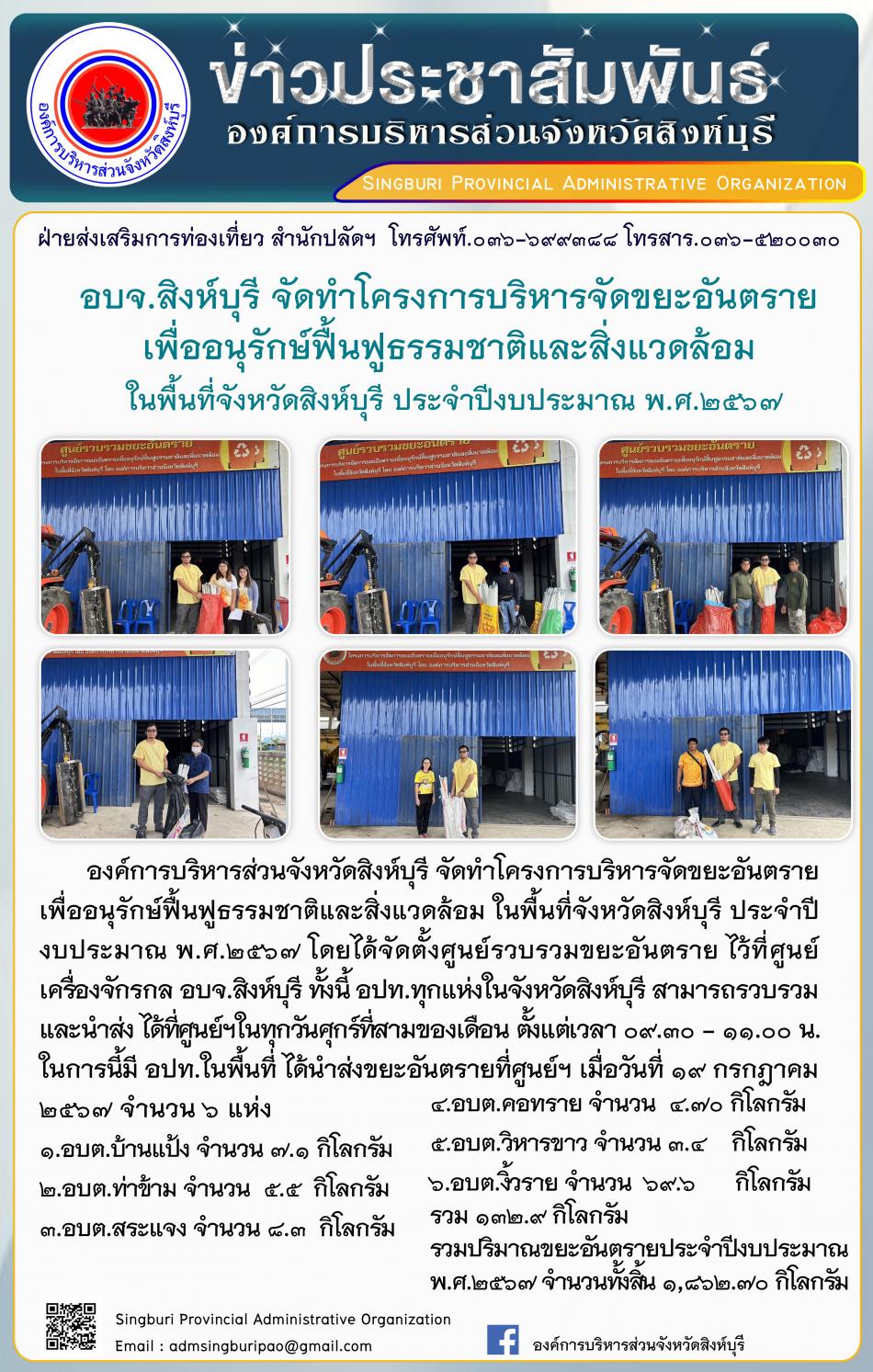 อบจ.สิงห์บุรี จัดทำโครงการบริหารจัดการขยะอันตราย เพื่ออนุรักษ์ฟื้นฟูธรรมชาติและสิ่งแวดล้อมในพื้นที่จังหวัดสิงห์บุรี ประจำปีงบประมาณ พ.ศ.2567