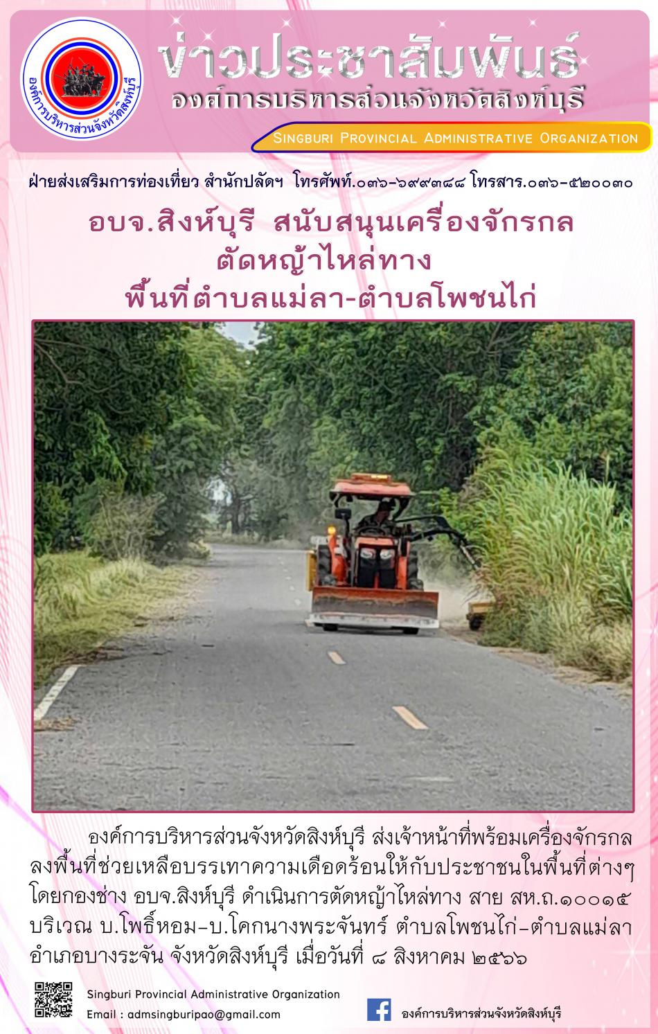 อบจ.สิงห์บุรี สนับสนุนเครื่องจักรกล ตัดหญ้าไหล่ทาง พื้นที่ตำบลแม่ลา - ตำบลโพชนไก่
