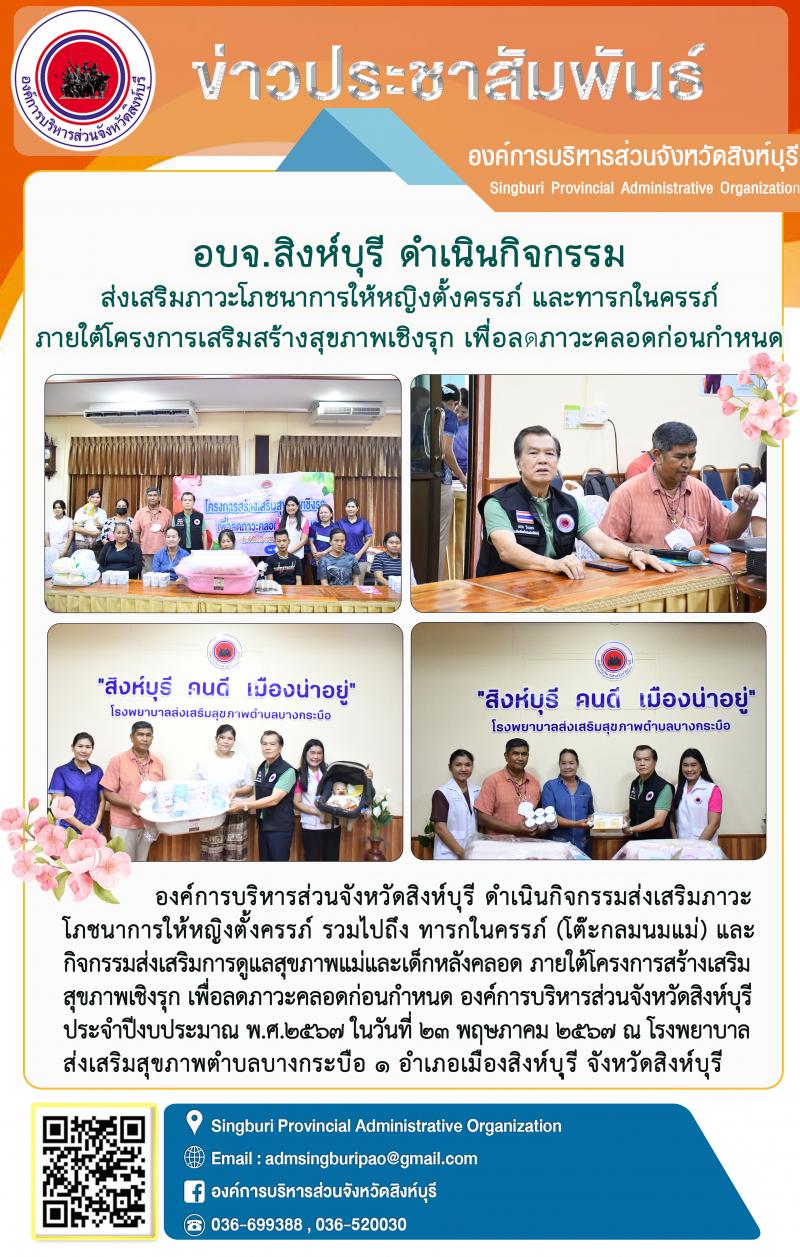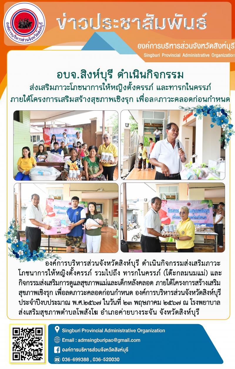 อบจ.สิงห์บุรี ดำเนินกิจกรรมส่งเสริมภาวะโภชนาการให้หญิงตั้งครรภ์ และทารกในครรภ์๓ายใต้โครงการเสริมสร้างสุขภาพเชิงรุก เพื่อลดภาวะคลอดก่อนกำหนด