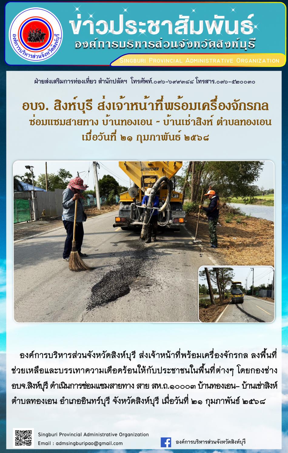 อบจ.สิงห์บุรี ส่งเจ้าหน้าที่พร้อมเครื่องจักรกล ซ่อมแซมสายทาง บ้านทองเอน - บ้านเซ่าสิงห์ ตำบลทองเอน