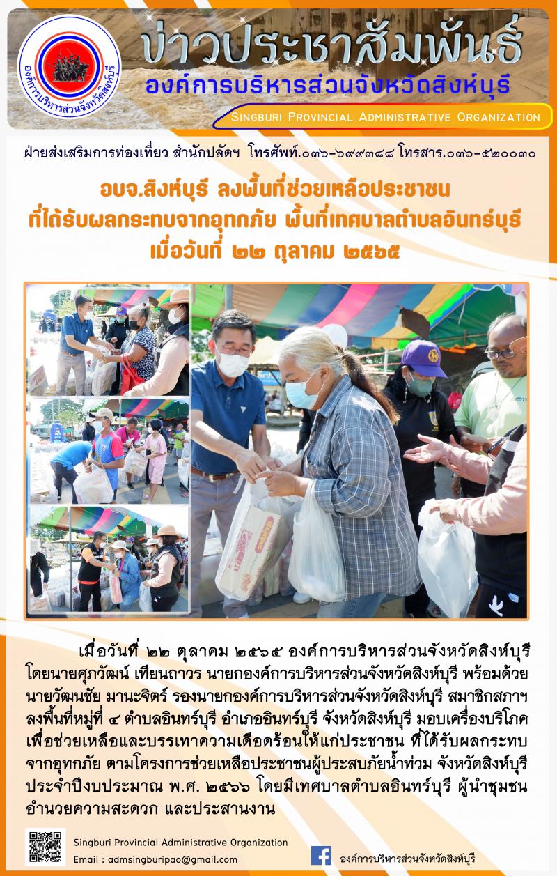 อบจ.สิงห์บุรี ลงพื้นที่ช่วยเหลือประชาชนที่ได้รับผลกระทบจากอุทกภัย พื้นที่เทศบาลตำบลอินทร์บุรี