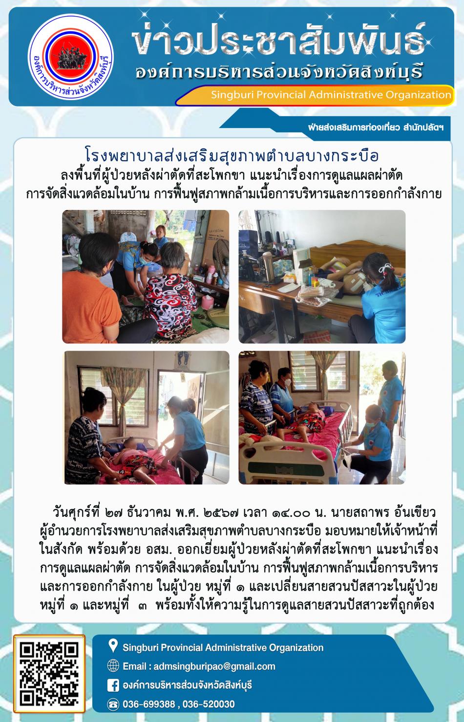 โรงพยาบาลส่งเสริมสุขภาพตำบลบางกระบือ ลงพื้นที่ผู้ป่วยผ่าตัดสะโพกขา แนะนำเรื่องการดูแลแผลผ่าตัด การจัดการสิ่งแวดล้อมในบ้าน การฟื้นฟูสภาพกล้ามเนื้อการบริหารและการออกกำลังกาย