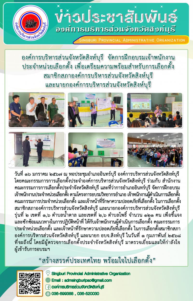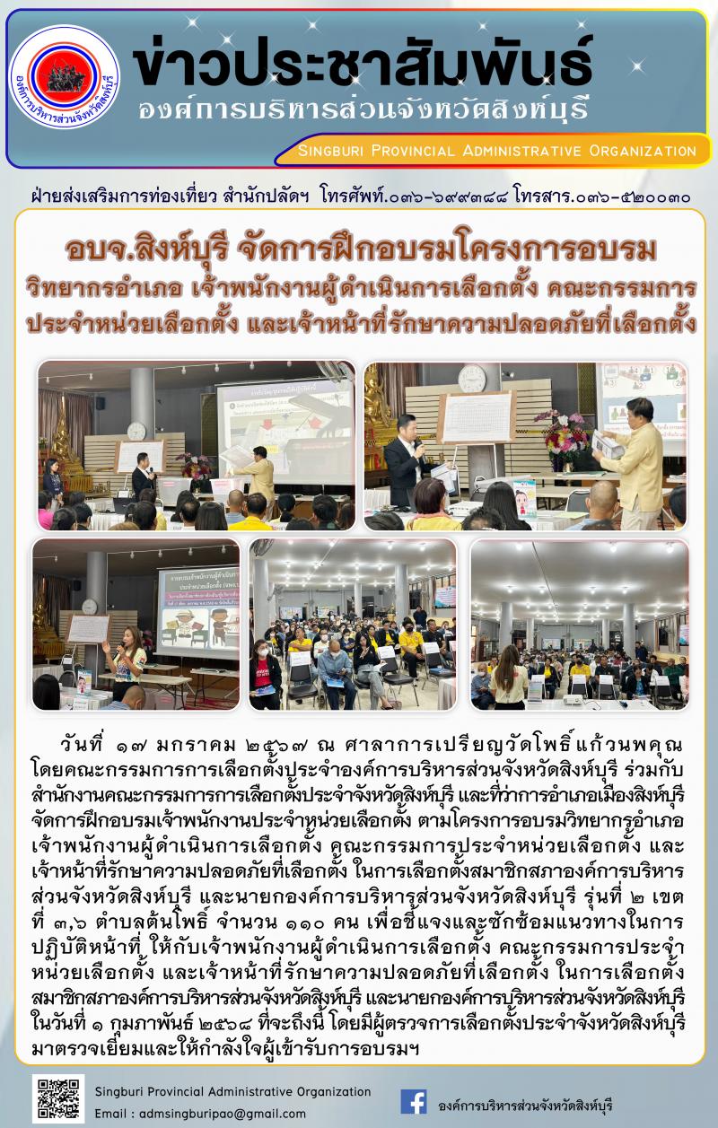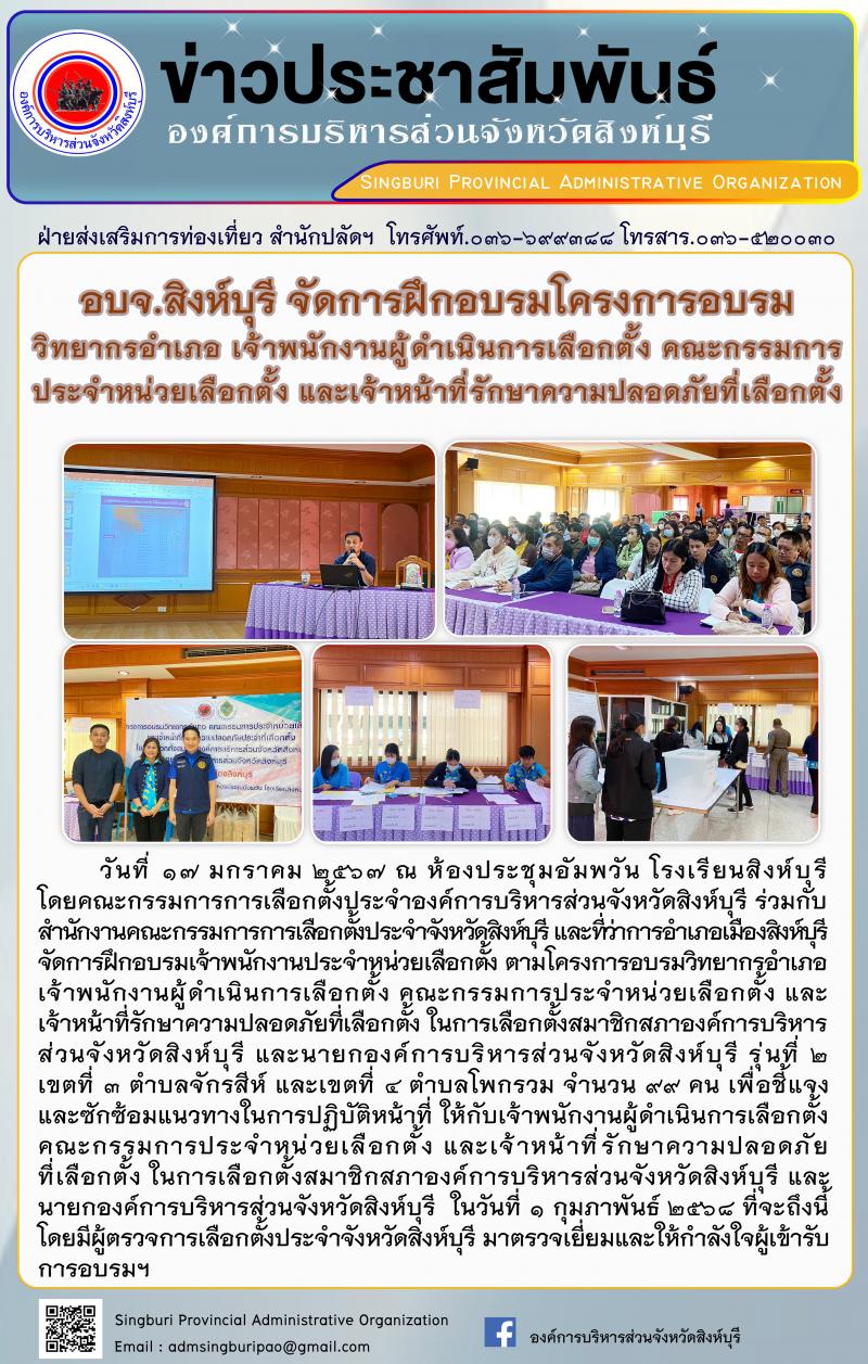 อบจ.สิงห์บุรี จัดการฝึกอบรมโครงการอบรมวิทยากรอำเภอ เจ้าพนักงานดำเนินการเลือกตั้ง คณะกรรมการประจำหน่วยเลือกตั้ง และเจ้าหน้าที่รักษาความปลอดภัยที่เลือกตั้ง