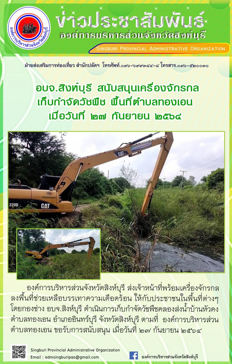 อบจ.สิงห์บุรี สนับสนุนเครื่องจักรกลกำจัดวัชพืช พื้นที่ตำบลไม้ดัด และพื้นที่ตำบลทองเอน