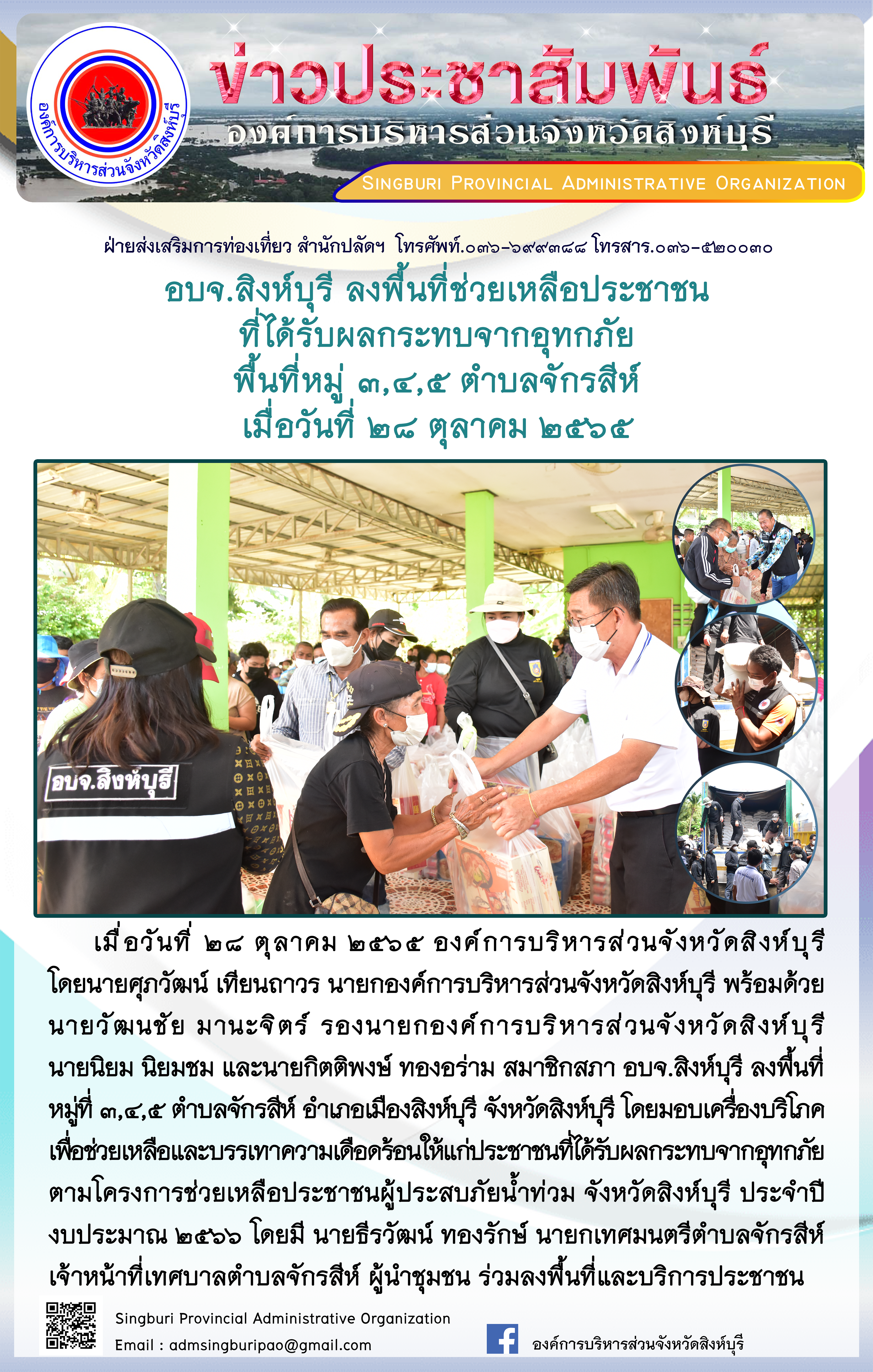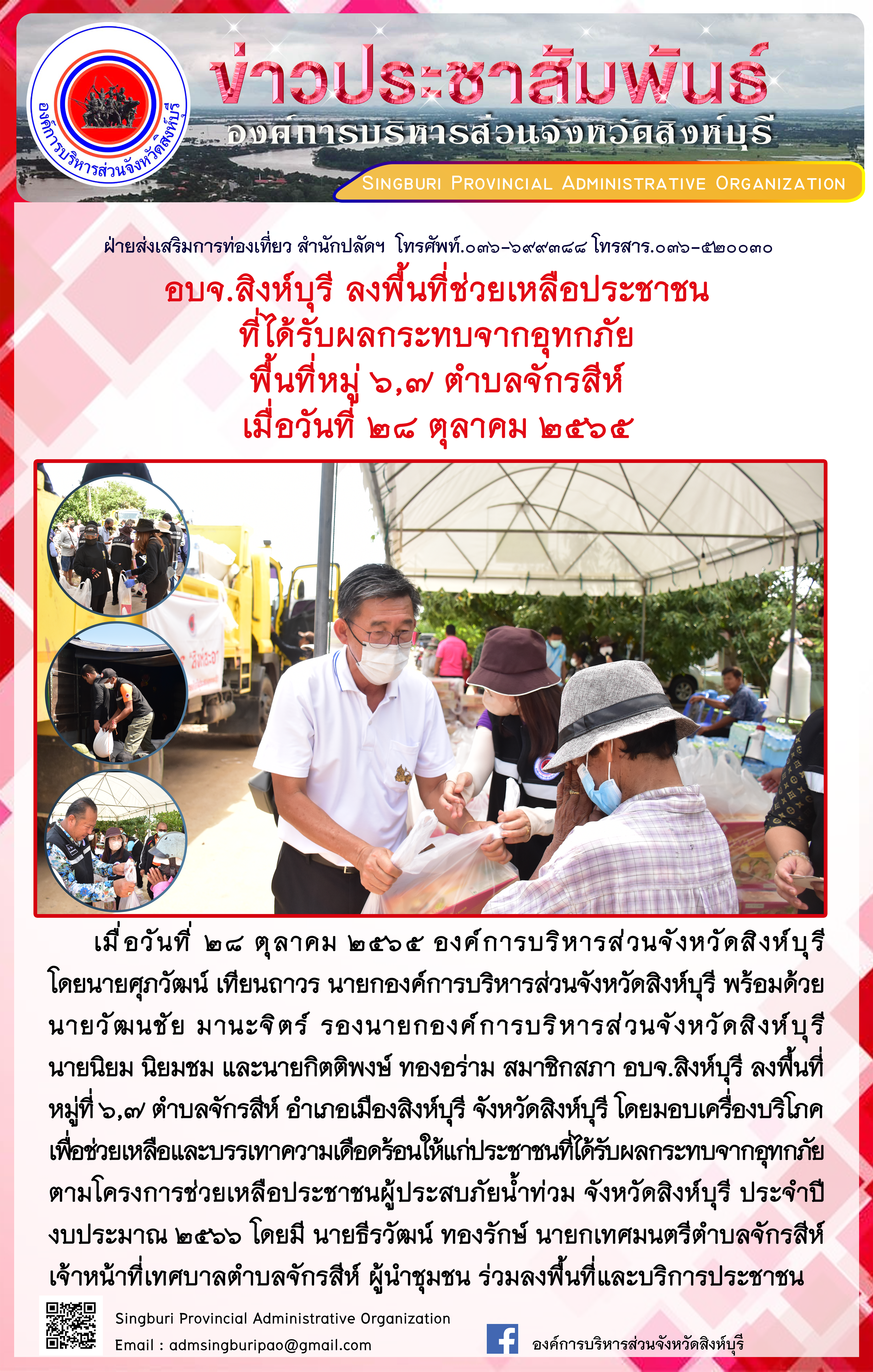 อบจ.สิงห์บุรี ลงพื้นที่ช่วยเหลือประชาชนที่ได้รับผลกระทบจากอุทกภัย พื้นที่ตำบลจักรสีห์