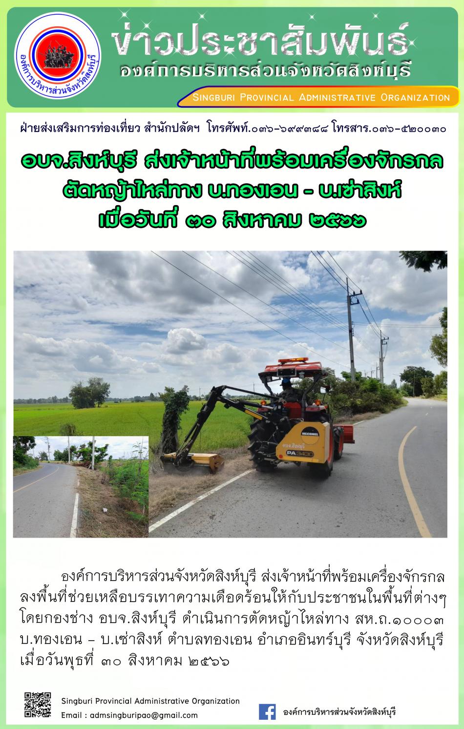 อบจ.สิงห์บุรี ส่งเจ้าหน้าที่พร้อมเครื่องจักรกล ตัดหญ้าไหล่ทาง บ.ทองเอน - บ.เซ่าสิงห์