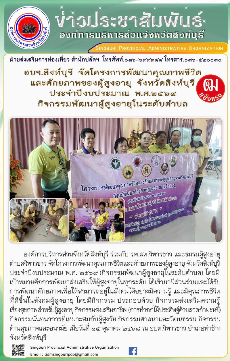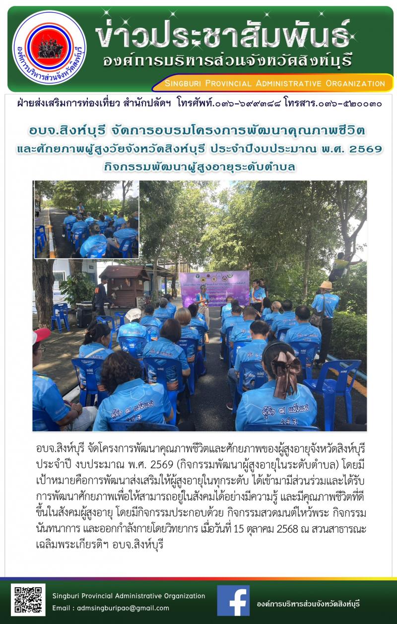 อบจ.สิงห์บุรี จัดการอบรมโครงการพัฒนาคุณภาพชีวิตและศักยภาพผู้สูงวัยจังหวัดสิงห์บุรี ประจำปีงบประมาณ พ.ศ. 2569 กิวกรรมพัฒนาผู้สูงอายุระดับตำบล