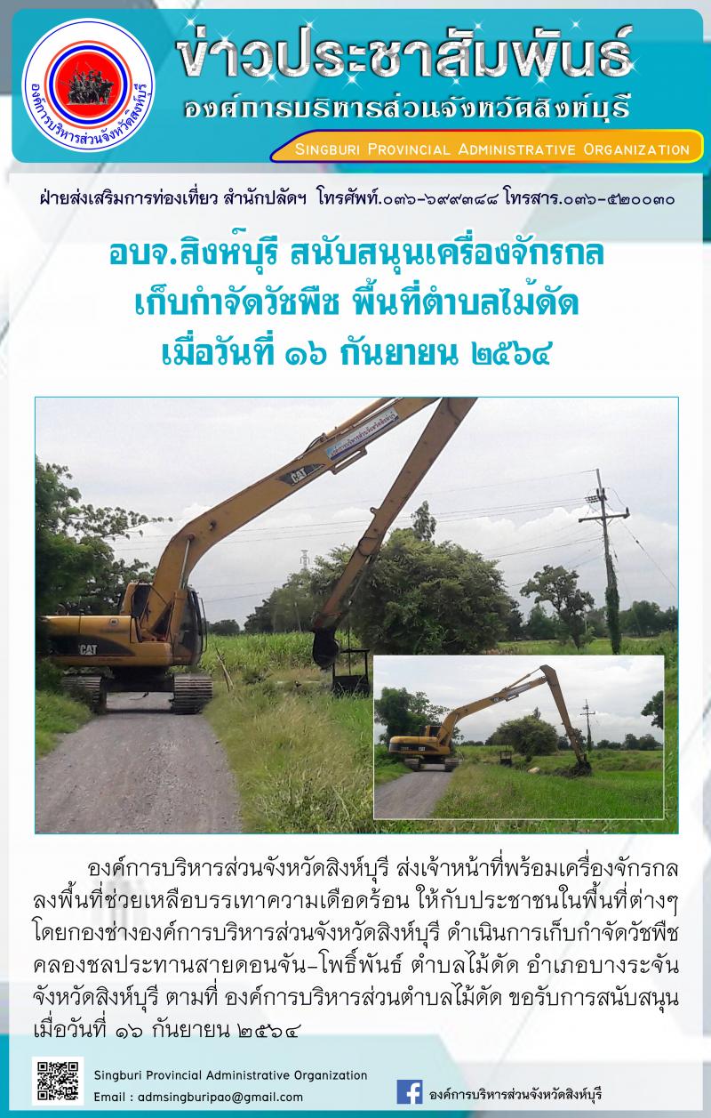 อบจ.สิงห์บุรี สนับสนุนเครื่องจักรกลกำจัดวัชพืช บริเวณลำแม่ลา