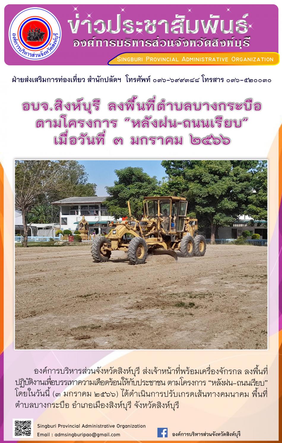 อบจ.สิงห์บุรี ลงพื้นที่ตำบลบางกระบือตามโครงการ "หลังฝนถนนเรียบ"