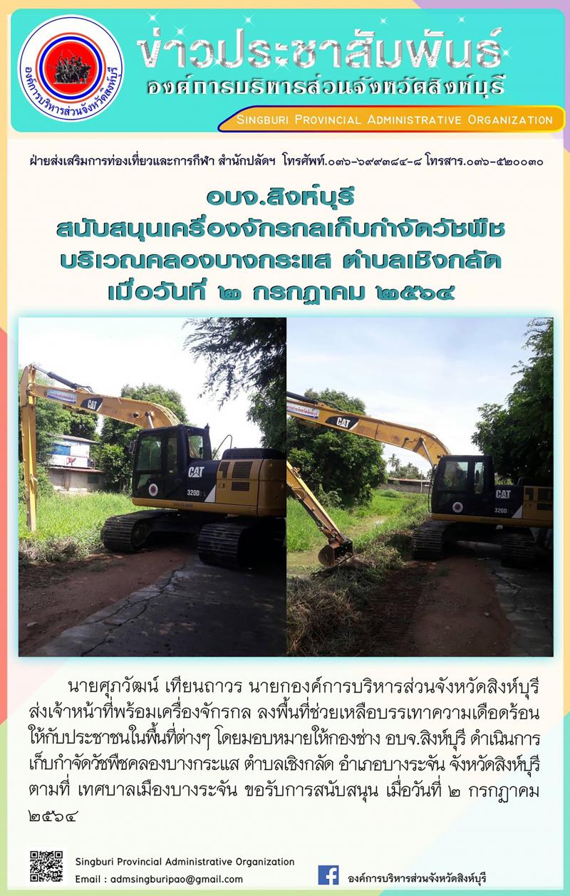 อบจ.สิงห์บุรี ส่งเจ้าหน้าทีพร้อมเครื่อจักรกลเก็บกำจัดวัชพืช พื้นที่ตำบลพิกุลทอง ตำบลเชิงกลัด