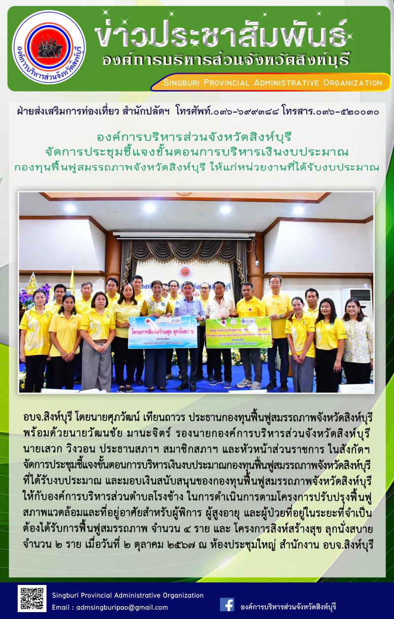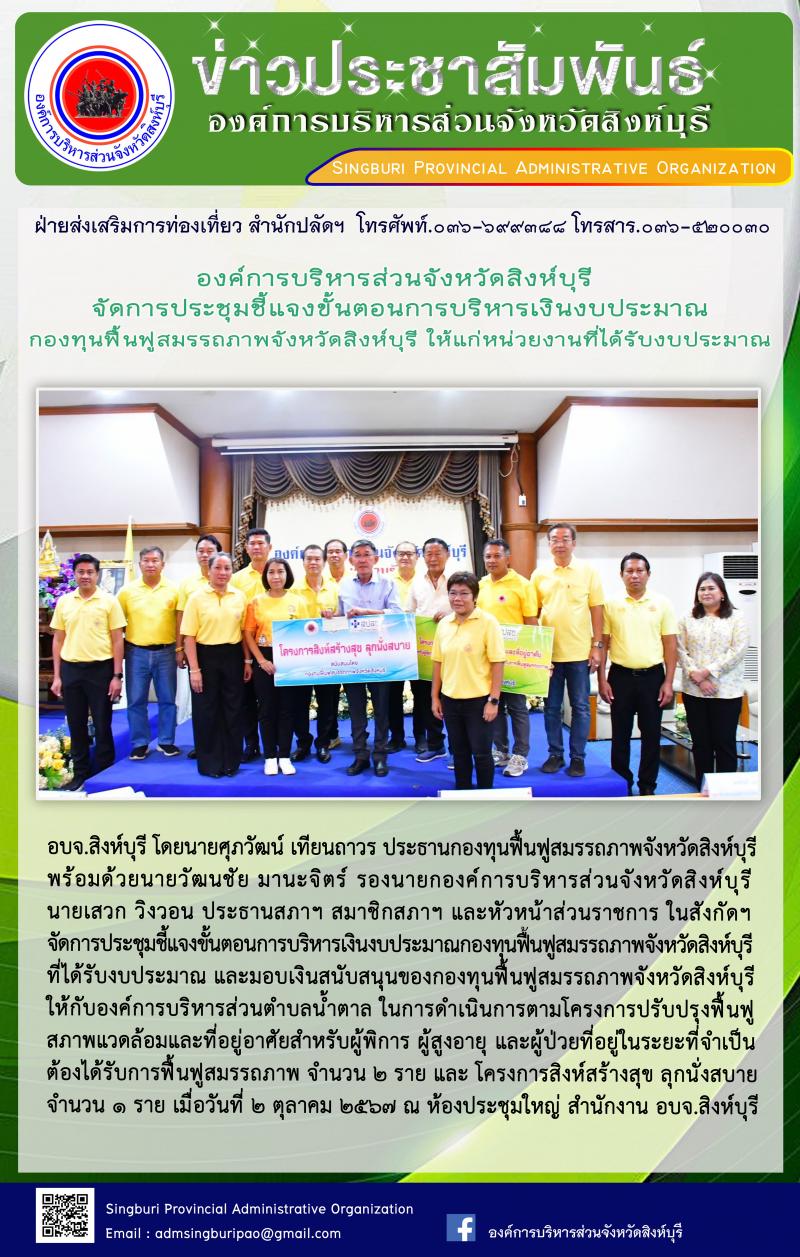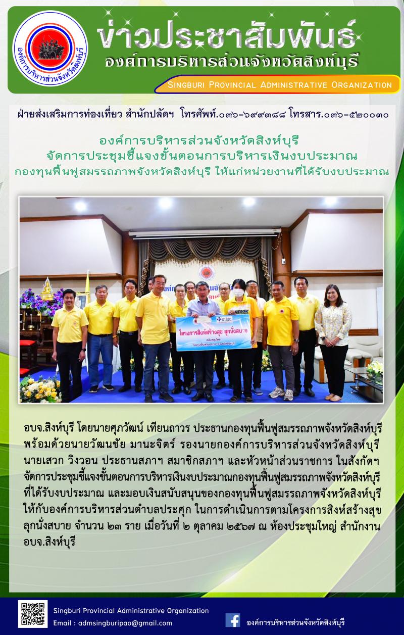 องค์การบริหารส่วนจังหวัดสิงห์บุรี จัดการประชุมชี้แจงขั้นต้อนการบริหารงบประมาณกองทุนฟื้นฟูสมรรถภาพจังหวัดสิงห์บุรี ให้แก่หน่วยงานที่ได้รับงบประมาณ