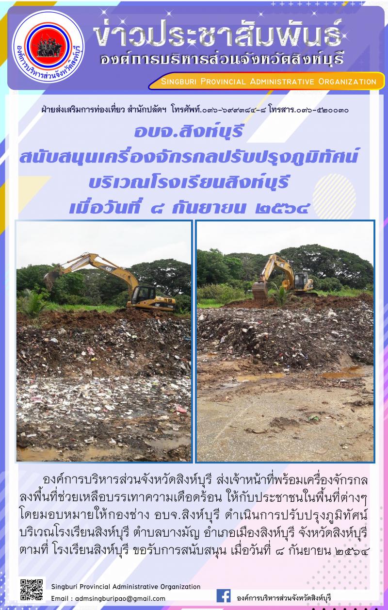 อบจ.สิงห์บุรี สนับสนุนเครื่องจักรกลกำจัดวัชพืช พื้นที่ ตำบลคอทราย แลปรับปรุงภูมิทัศน์ บริเวณโรงเรียนสิงห์บุรี