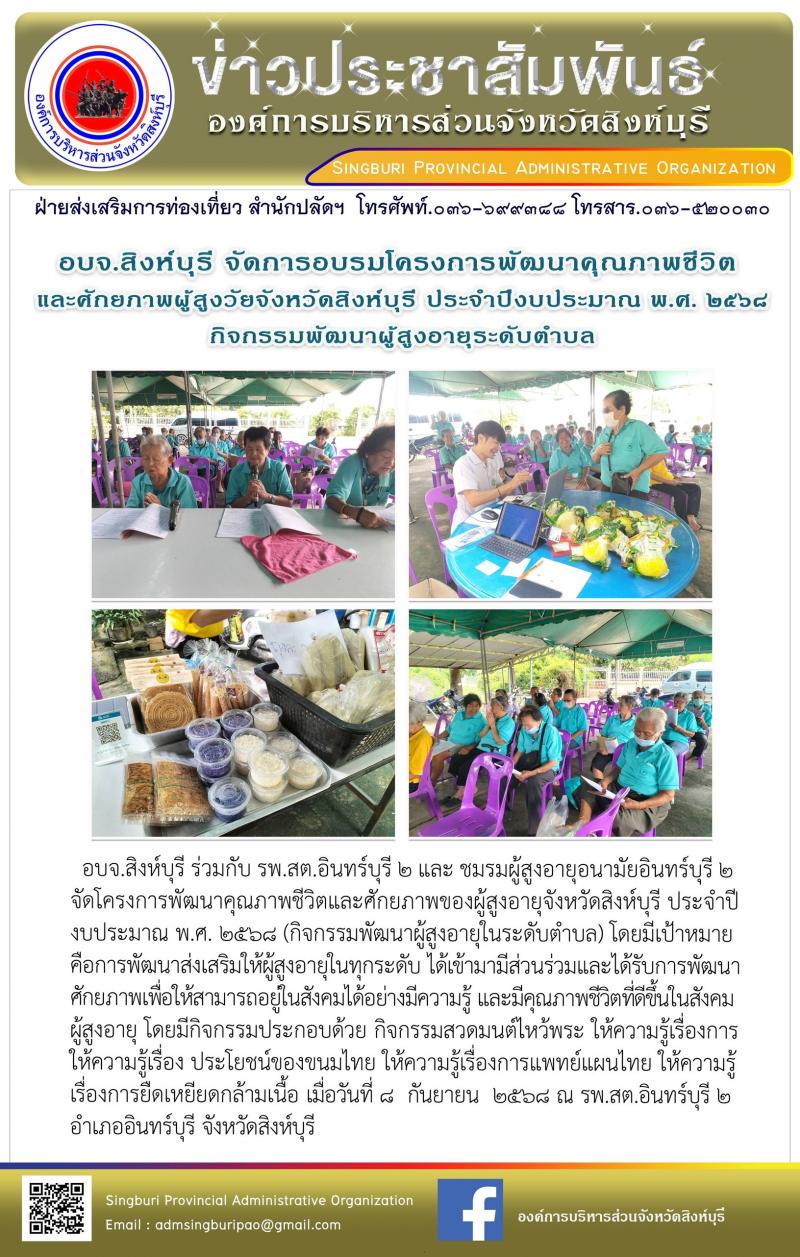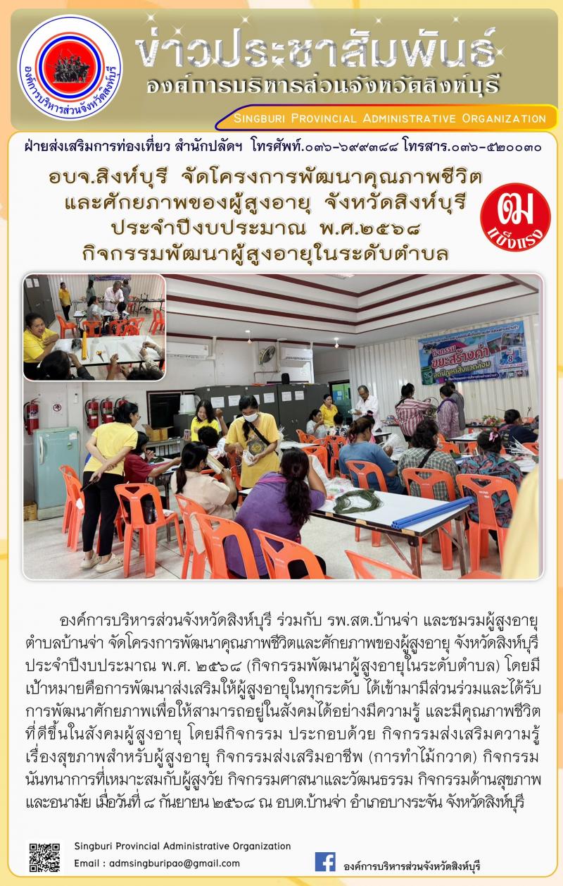 อบจ. สิงห์บุรี จัดโครงการพัฒนาคุณภาพชีวิตและศักยภาพของผู้สูงอายุ จังหวัด สิงห์บุรี ประจำประจำปีงบประมาณปี พ. ศ. 2568 กิจกรรมพัฒนาผู้สูงอายุในระดับตำบลกิจกรรมพัฒนาผู้สูงอายุในระดับตำบล