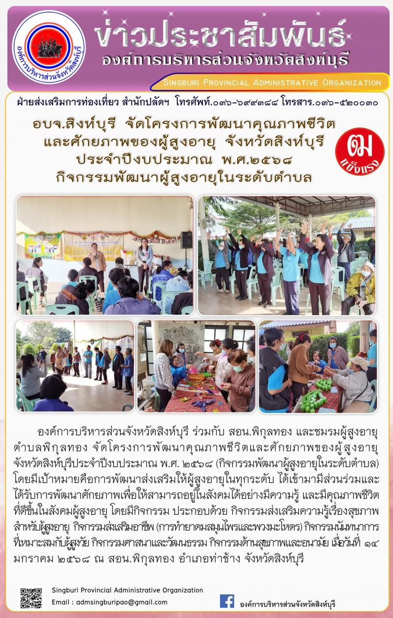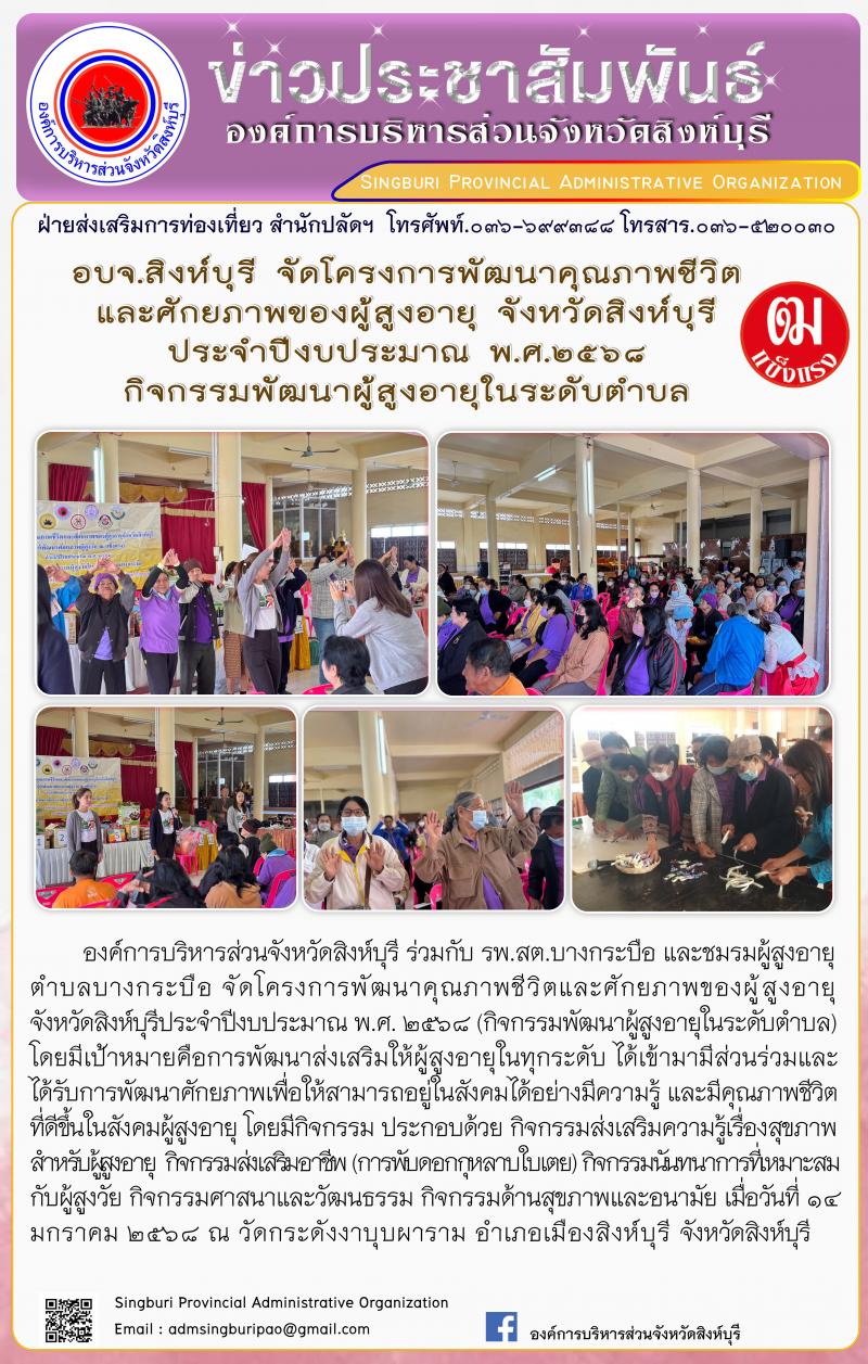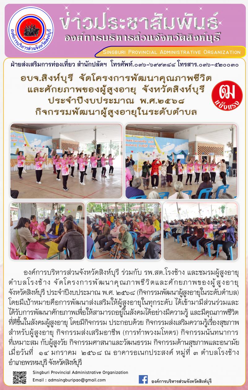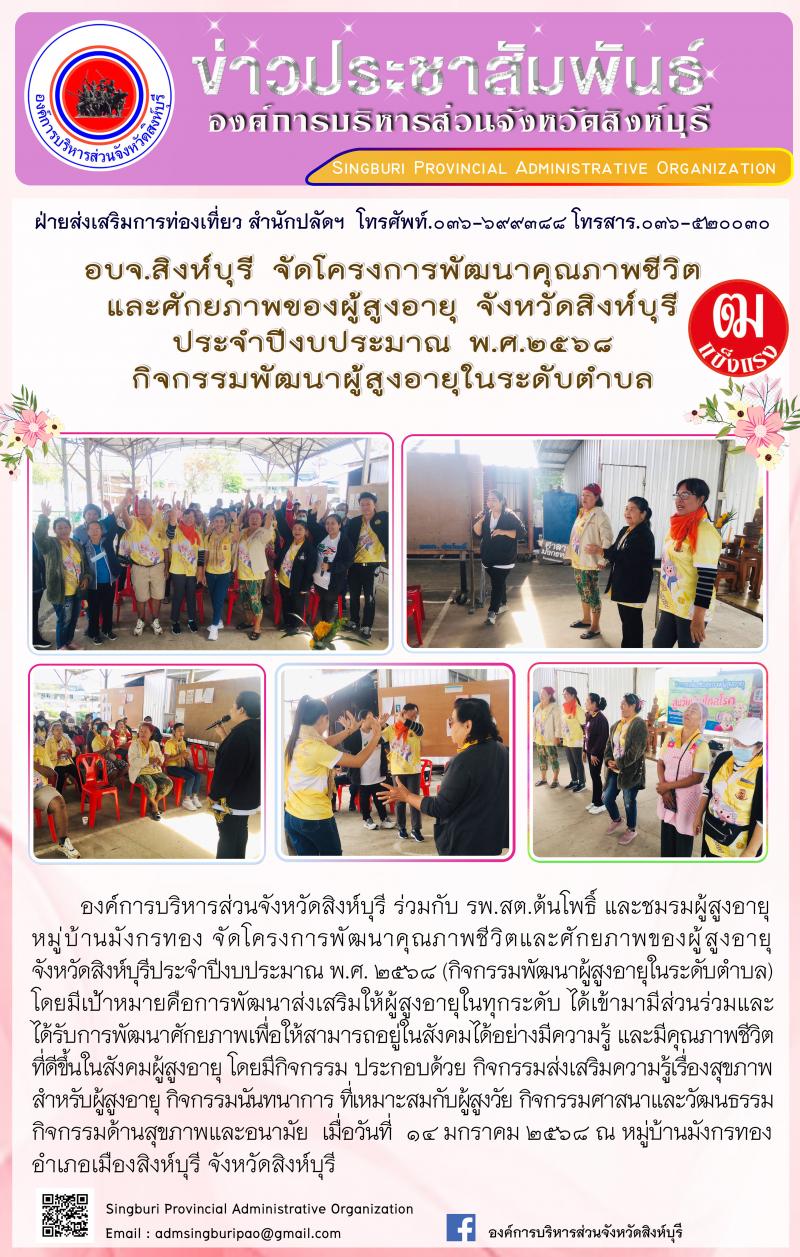 อบจ.สิงห์บุรี จัดโครงการพัฒนาคุณภาพชีวิตและศักยภาพของผู้สูงอายุ จังหวัดสิงห์บุรี ประจำปีงบประมาณ พ.ศ.2568 กิจกรรมพัฒนาผู้สูงอายุในระดับตำบล