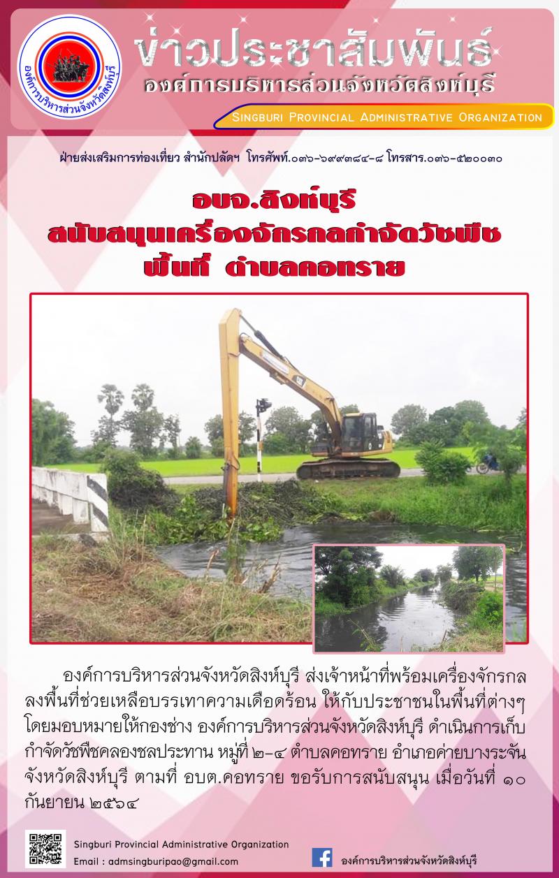 อบจ.สิงห์บุรี ส่งเจ้าหน้าที่พร้อมเครื่องจักร เก็บกำจัดวัชพืช บริเวณลำแม่ลา และตำบลคอทราย