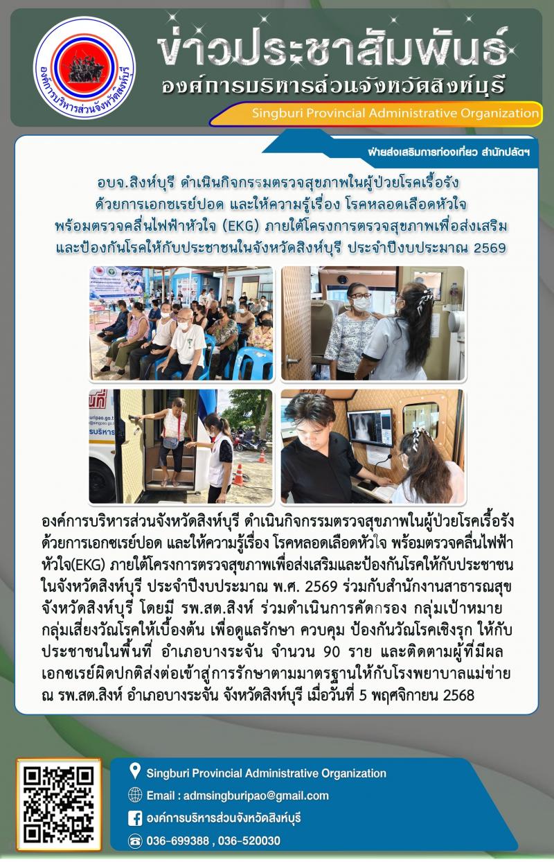 อบจ.สิงห์บุรี ดำเนินกิจกรรมตรวจสุขภาพในผู้ป่วยโรคเรื้อรังด้วยการเอกซเรย์ปอดและให้ความรู้เรื่องโรคหลอด เลือดหัวใจพร้อมตรวจคลื่นไฟฟ้าหัวใจ ( EKG) ภายใต้โครงการตรวจสุขภาพเพื่อส่งเสริมและป้องกินโรดให้กับประชาชนจังหวัดสิงห์บุรี ประจำปีงบประมาณ 2569