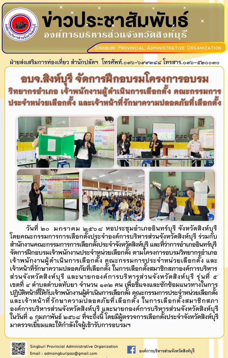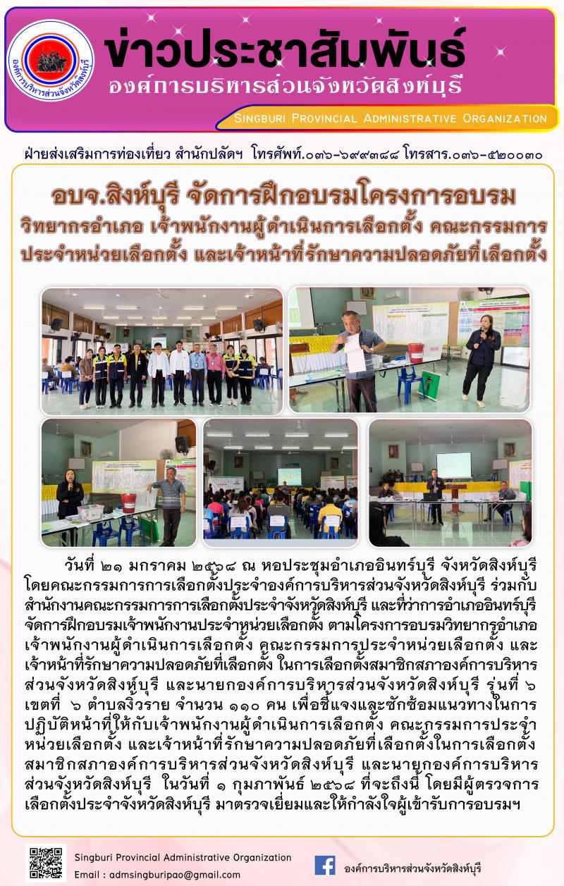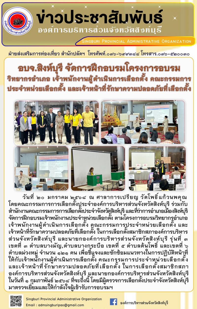 อบจ.สิงห์บุรี จัดการฝึกอบรมโครงการอบรมวิทยากรอำเภอ เจ้าพนักงานดำเนินการเลือกตั้ง คณะกรรมการประจำหน่วยเลือกตั้ง และเจ้าหน้าที่รักษาความปลอดภัยที่เลือกตั้ง