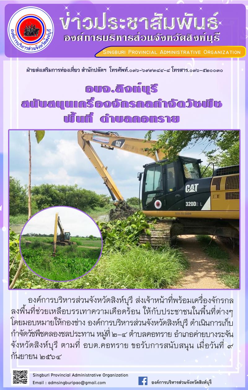 อบจ.สิงห์บุรี ส่งเจ้าหน้าทีพร้อมเครื่อจักรกลเก็บกำจัดวัชพืช บริเวณลำน้ำแม่ลาฯ