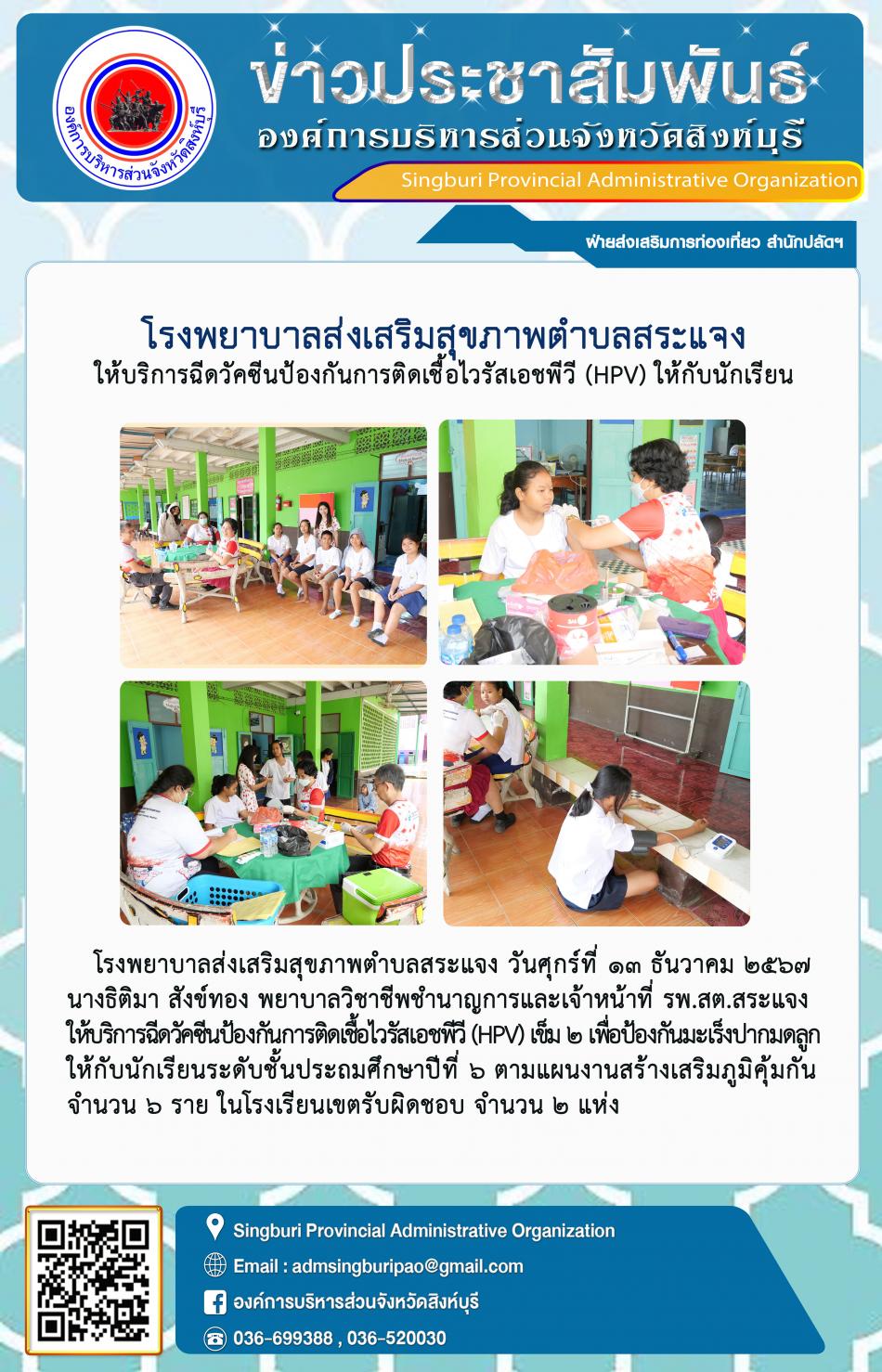 โรงพยาบาลส่งเสริมสุขภาพตำบลสระแจง ให้บริการฉีดวัคซีนป้องกันการติดเชื้อไวรัสเอชพีวี (HPV) ให้กับนักเรียน