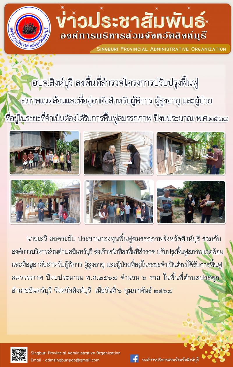 อบจ.สิงห์บุรี ลงพื้นที่สำรวจโครงการปรับปรุงฟื้นฟู สภาพแวดล้อมและที่อยู่อาศัย สำหรับผู้พิการ ผู้สูงอายุ และผู้ป่วย ที่อยู่ในระยะที่จำเป็นต้องได้รับการฟื้นฟูสมรรถภาพ ปีงบประมาณ พ.ศ.2568