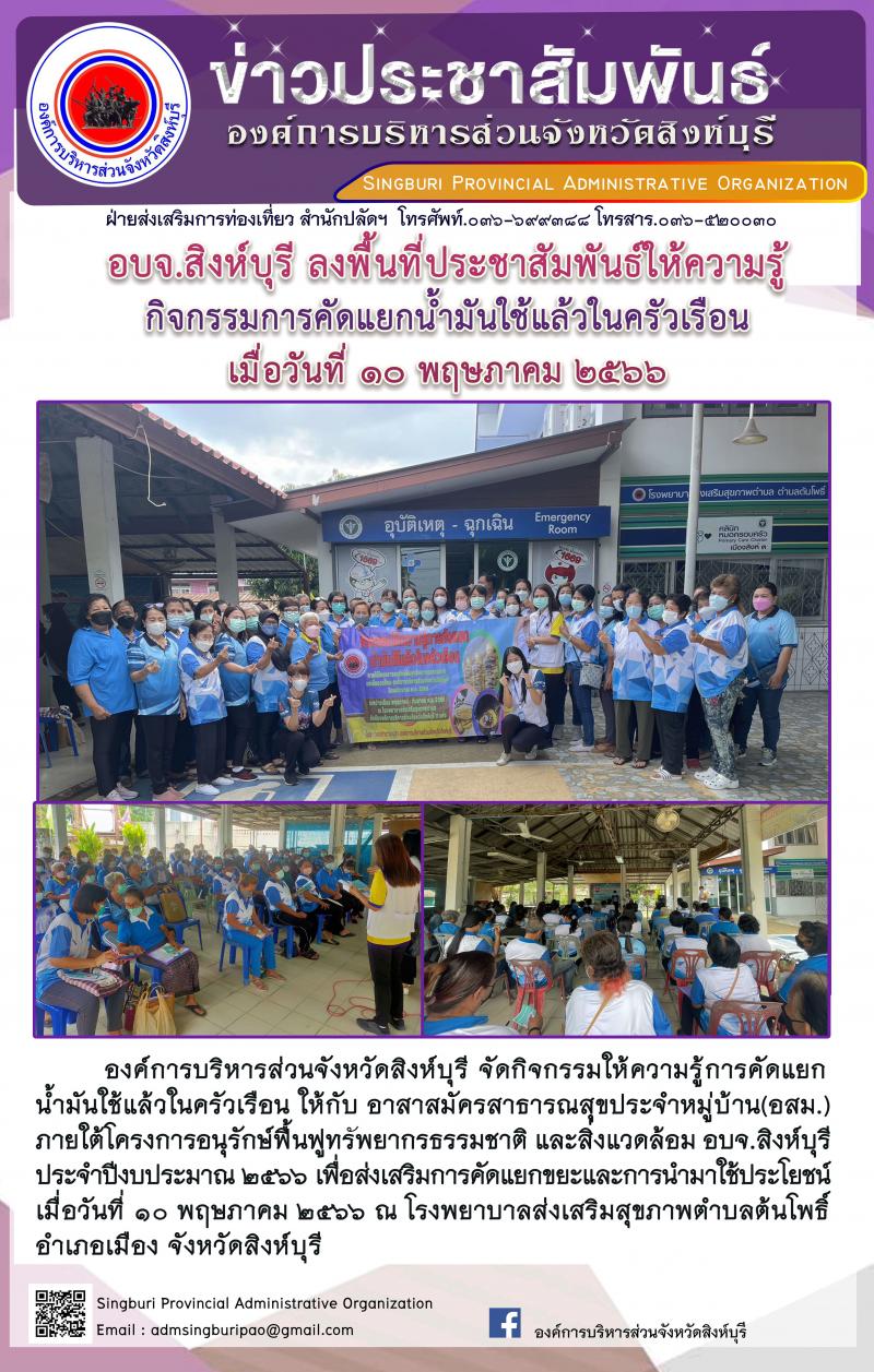 อบจ.สิงห์บุรี ลงพื้นที่ประชาสัมพันธ์ให้ความรู้ กิจกรรมการคัดแยกน้ำมันใช้แล้วในครัวเรือน