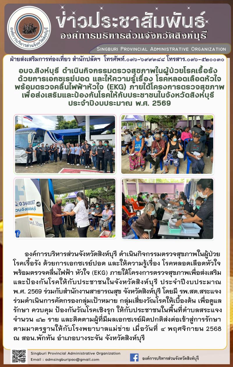 อบจ. สิงห์บุรี ดำเนินกิจกรรมตรวจสุขภาพ ในผู้ป่วยโรคเรื้อรังด้วยการเอ็กซเรย์ปอดและให้ความรู้เรื่องโรคหลอดเลือดหัวใจพร้อมตรวจคลื่นไฟฟ้าหัวใจ(EKG) ภายใต้โครงการตรวจสุขภาพเพื่อส่งเสริมและป้องกันโรคให้กับประชาชนในจังหวัดสิงห์บุรี ประจำปีงบประมาณ พ.ศ. 2569