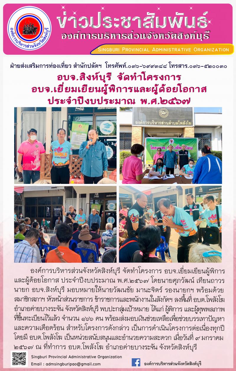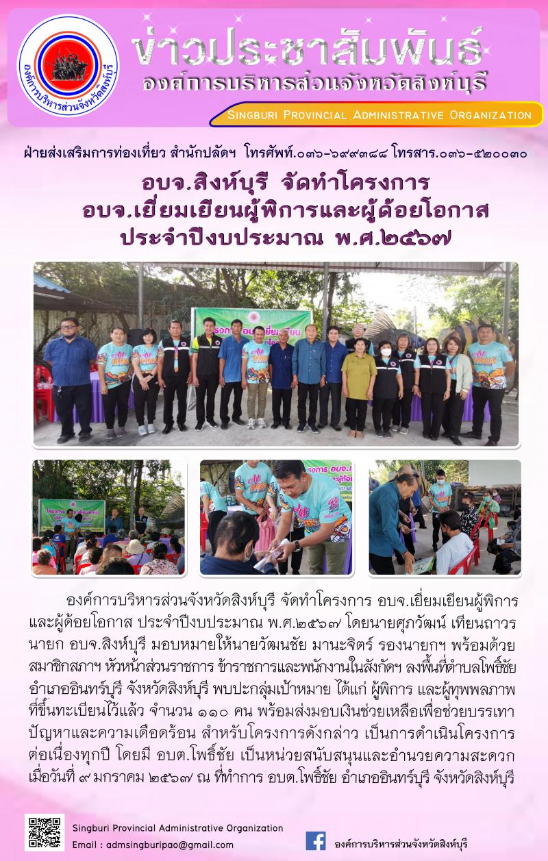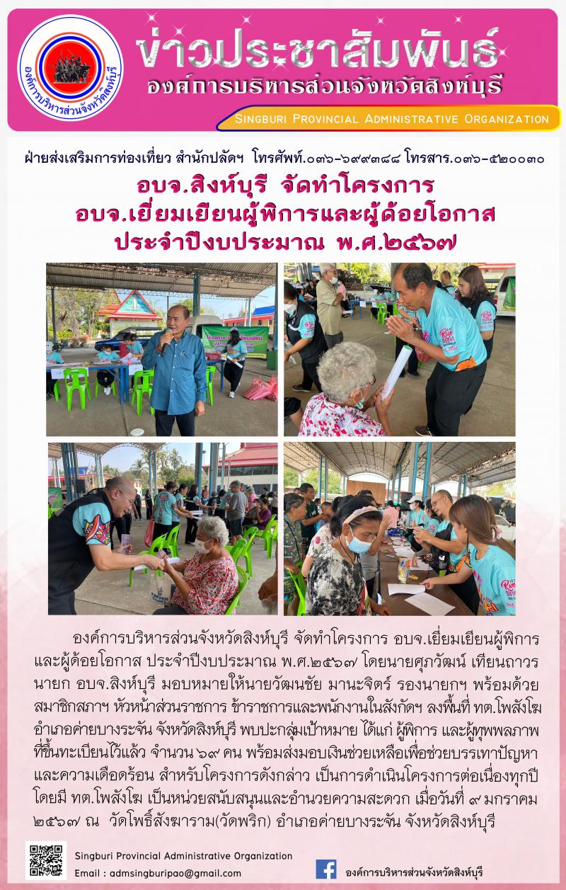 อบจ.สิงห์บุรี จัดทำโครงการ อบจ.เยี่ยมเยียนผู้พิการและผู้ด้อยโอกาส ประจำปี 2567