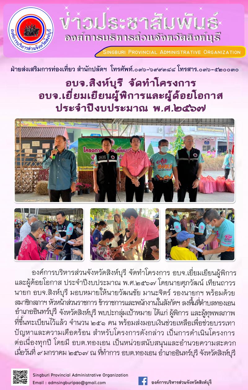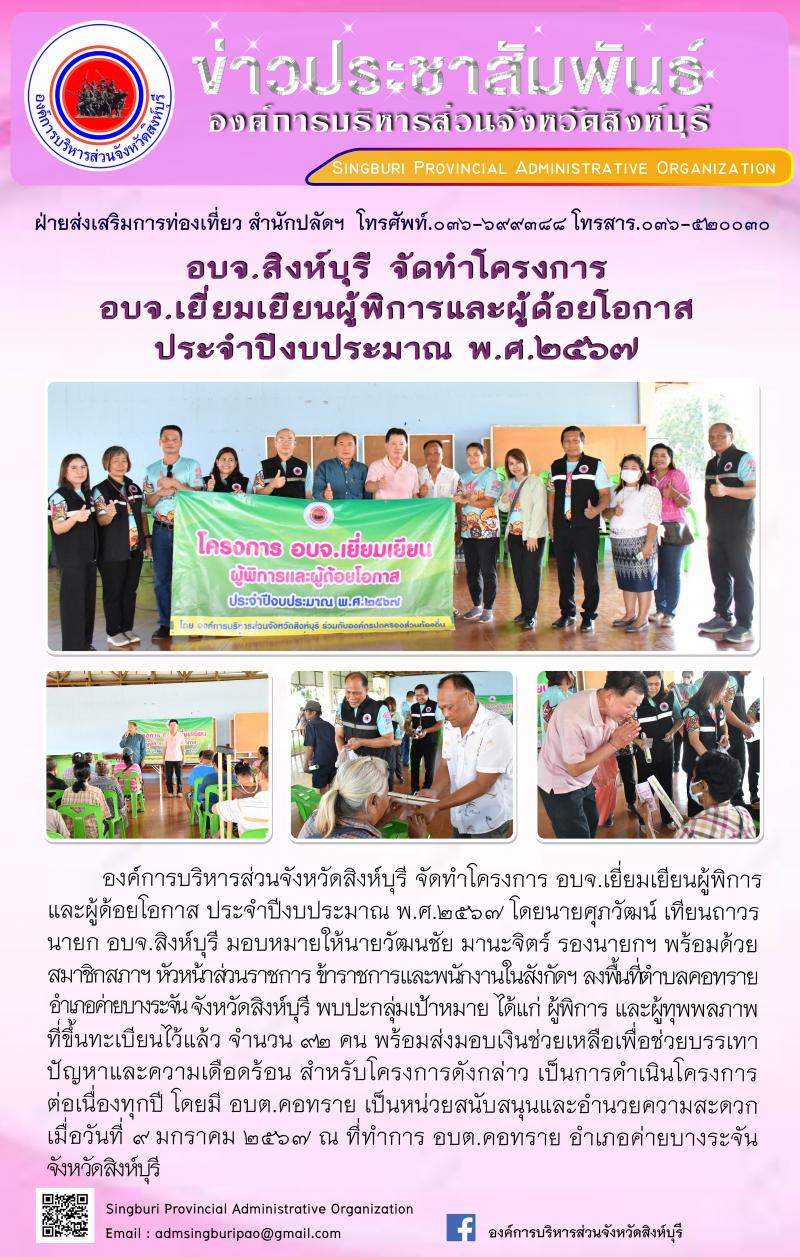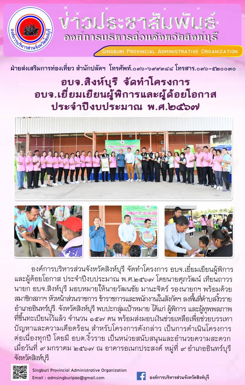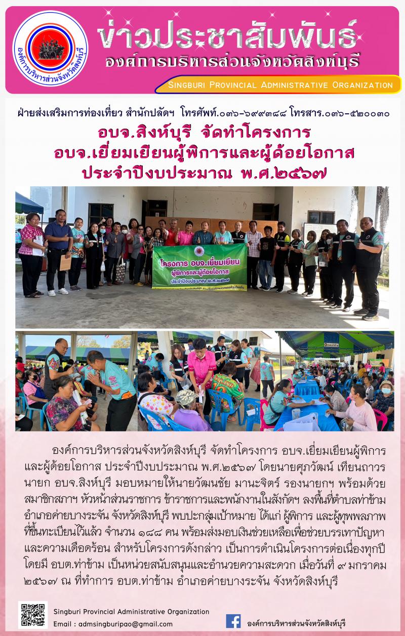 อบจ.สิงห์บุรี จัดทำโครงการ อบจ.เยี่ยมเยียนผู้พิการและผู้ด้อยโอกาส ประจำปี 2567