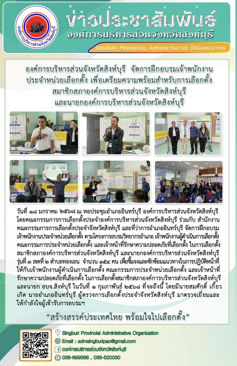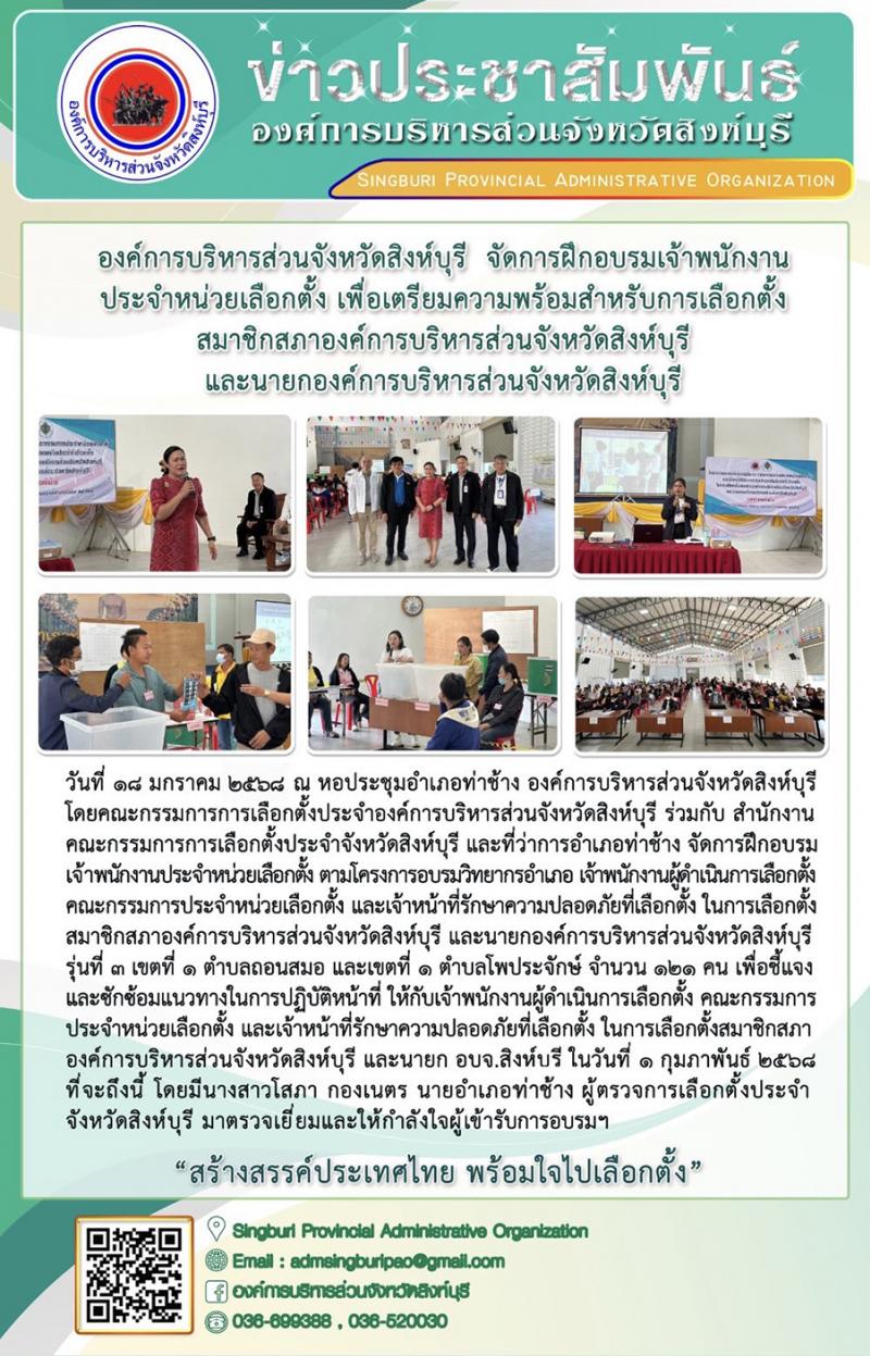 องค์การบริหารส่วนจังหวัดสิงห์บุรี จัดการฝึกอบรมเจ้าพนักงานประจำหน่วยเลือกตั้ง เพื่อเตียมความพร้อมสำหรับการเลือกตั้ง สมาชิกสภาองค์การบริหารส่วนจังหวัดสิงห์บุรี และนายกองค์การบริหารส่วนจังหวัดสิงห์บุรี
