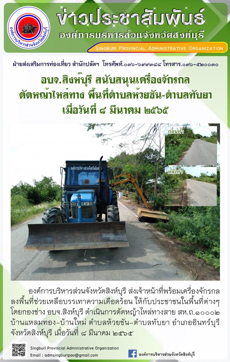 อบจ.สิงห์บุรี สนับสนุนเครื่องจักรกล ตัดหญ้าไหลทาง พื้นที่ตำบลห้วยชัน-ตำบลทับยา