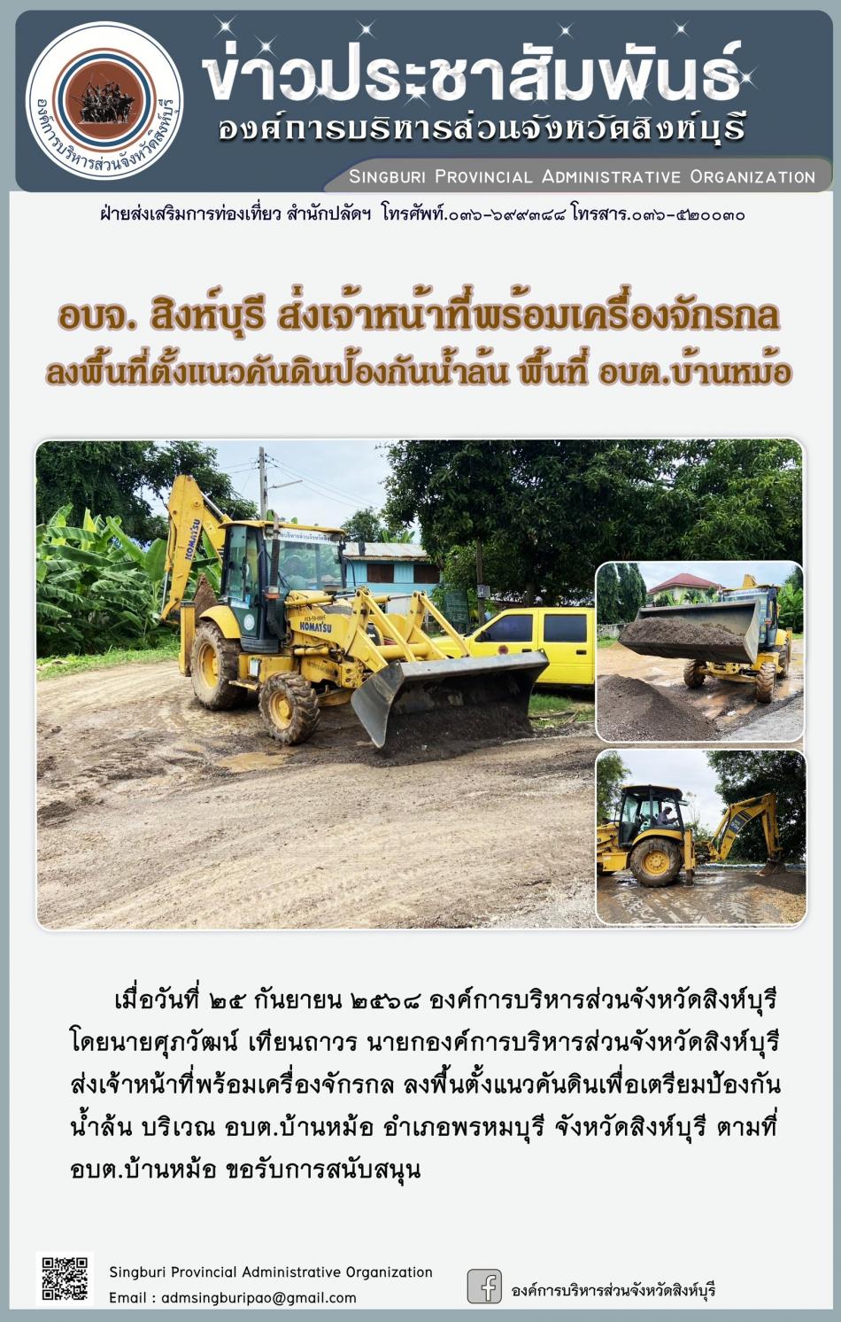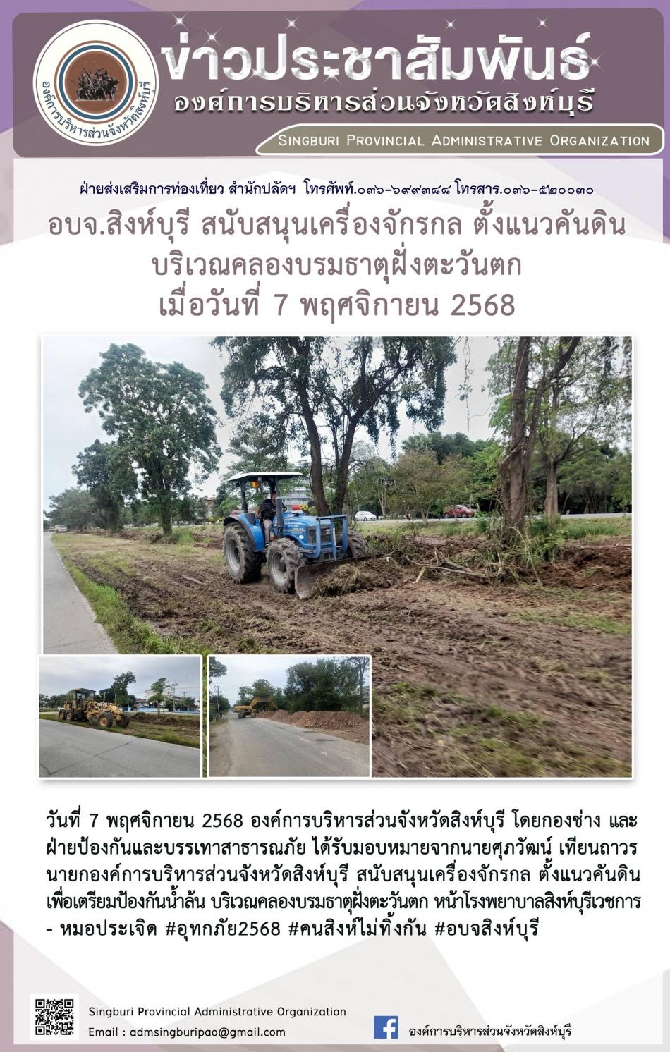 อบจ.สิงห์บุรี ส่งเจ้าหน้าที่พร้อมเครื่องจักรกล ลงพื้นที่ตั้งแนวคันดินป้องกันน้ำล้นลงพื้นที่ตั้งแนวคันดินป้องกันน้ำล้น พื้นที่ อบต บ้านหมอ้ [7 พฤศจิกายน 2568]