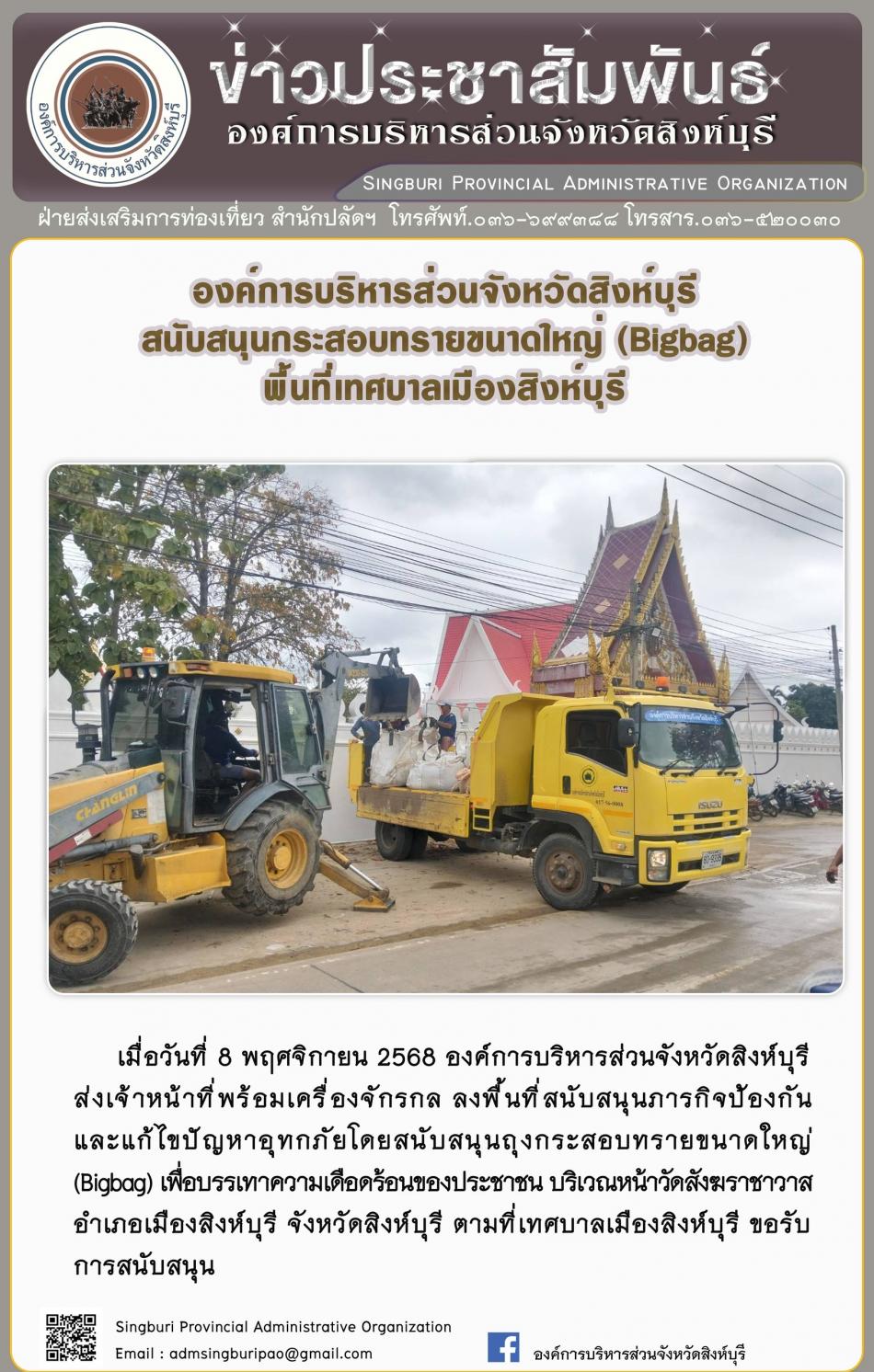 องค์การบริหารส่วนจังหวัดสิงห์บุรี สนับสนุนกระสอบทรายขนาดใหญ่ (bigbag) พื้นที่เทศบาลเมืองสิงห์บุรี [8 พฤศจิกายน 2568]
