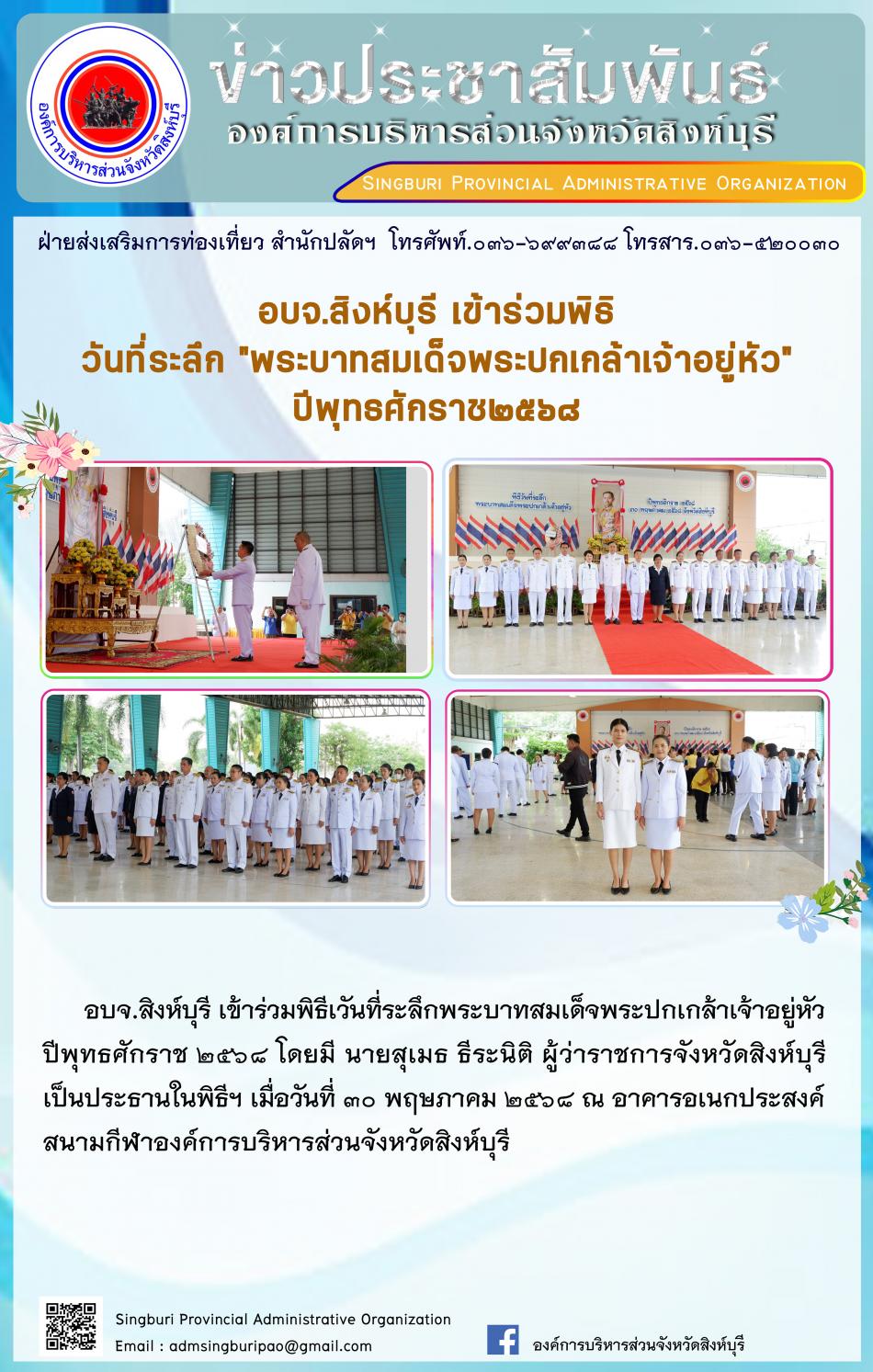 อบจ.สิงห์บุรี เข้าร่วมพิธี วันที่ระลึก "พระบาทสมเด็จพระปกเกล้าเจ้าอยู่หัว " ปีพุทธศักราช 2568 [30 พฤษภาคม 2568]