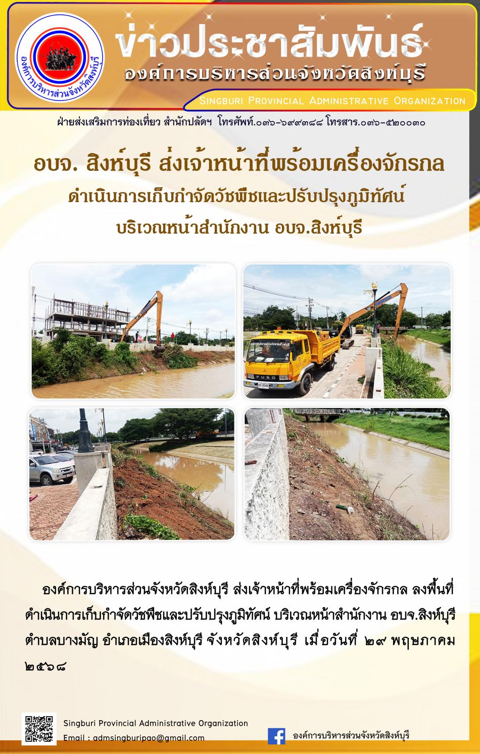 อบจ.สิงห์บุรี ส่งเจ้าหน้าที่พร้อมเครื่องจักรกล เดำเนินการเก็บกำจัดวัชพืชและปรับปรุงภูมิทัศน์ บริเวณหน้าสำนักงาน อบจ.สิงห์บุรี [29 พฤษภาคม 2568]